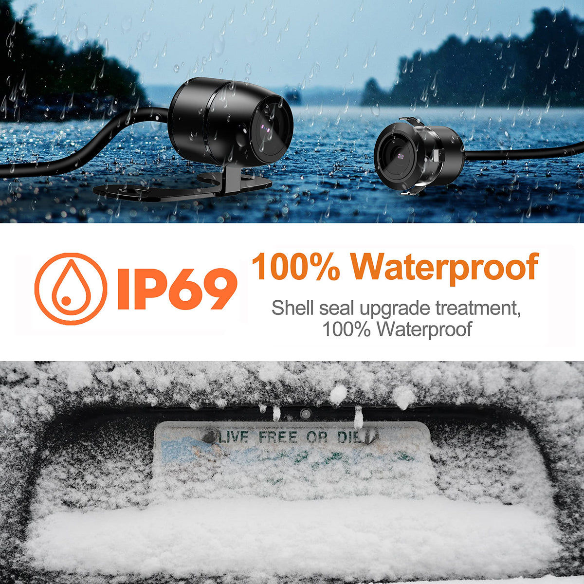 Q: Is the RAAYOO backup camera waterproof?A: Yes, the RAAYOO backup camera has a metal housing and is rated IP69 waterproof, ensuring protection against water, fog, and mist, making it suitable for various weather conditions.