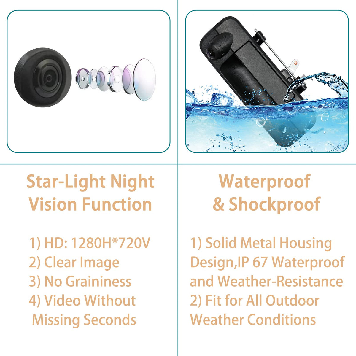 Q: What image quality can I expect from this backup camera?A: The backup camera provides a 720P crystal clear image, featuring a 170° viewing angle which enhances your parking and reversing experience, even in low-light conditions.