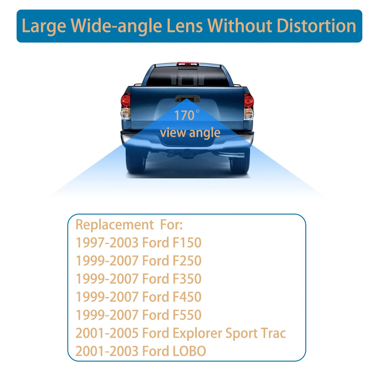 Image Sensor: 1/3 Starlight Night Vision (Use The Chip Sensor And Lens Of 360 System)Waterproof Rate: Ip67Power: 12V-24Voperating Temperature: -22 To 176 Fahrenheitpacking List:1 X Tailgate Handle With Camera1 X 8M Video Extension Cable(Rca)1 X Instructioncompatible With:1997-2003 Ford F1501999-2007 Ford F250&Nbsp;1999-2007 Ford F350&Nbsp;1999-2007 Ford F450&Nbsp;1999-2007 Ford F5502001-2005 Ford Explorer Sport Trac2001-2003 Ford Lobotailgate Handle: The Tailgate Handle Is An External Component That Triggers The Latch Mechanism And Allows The Tailgates To Swing Open. When The Tailgate Handle Is Lifted, The Latch Mechanism Holding The Tailgate Shell Is Released, Allowing The Gate To Open. Replacing A Faulty Tailgate Handle Is Important To Restore The Functionality Of Your Vehicles Tailgate, Manage The Deterioration Of Internal Components, And Keep Payloads Safe.Ideal Auto Backup Camera: Suit For 12-24V Dc Power. 8M Rca Video Cable Protected With Pa Plastic Bellows. Which Offers Perfect Protection Against The Acid, Lubricating Oil Abd Coolant, Can Work Constantly For Long Time. With The Help Of Wired Universal Tundra Reversing Camera, You Wont Be Disturbed When You Reverse Your Toyota Tundra Even In Adverse Environment.