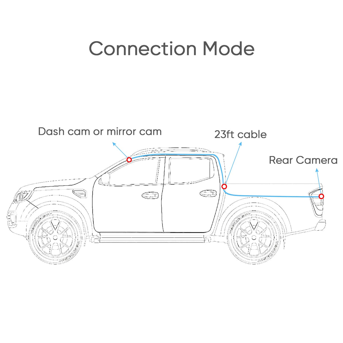 Q: What is the length of the Dash Cam Rear Camera Cable?A: The Dash Cam Rear Camera Cable is 23 feet long, providing ample length for installation in various vehicle types such as pickups, SUVs, RVs, trailers, and buses.