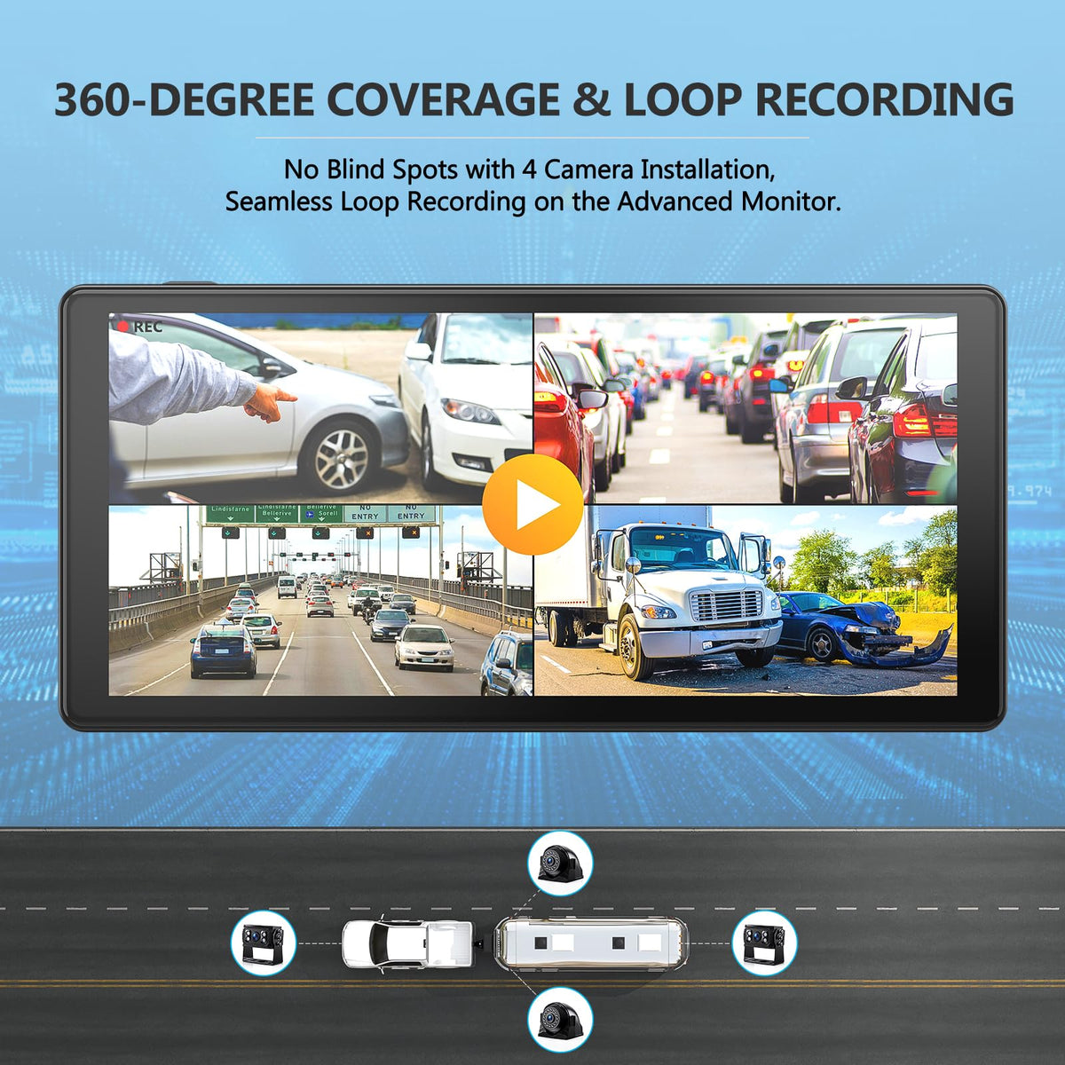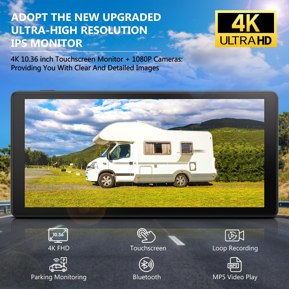 Dvknm 4K Rv Backup Camera System 10.36'' Quad Split Touchscreen Monitor 4 1080P Hd Rear View Cameras Dvr Recording Bluetooth Mus