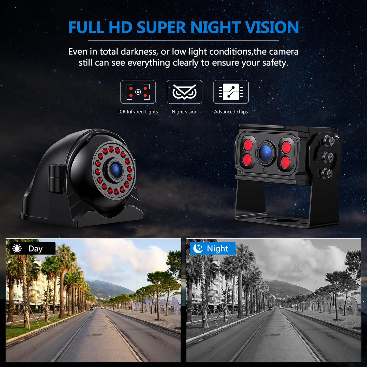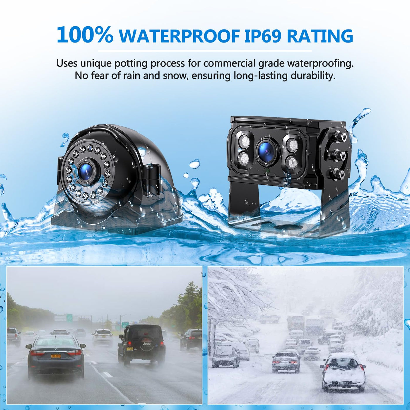 Q: What features make the DVKNM 4K RV Backup Camera System ideal for RVs and trailers?A: The DVKNM 4K RV Backup Camera System includes a 10.36" quad split touchscreen monitor and four 1080P HD rear view cameras, providing super realistic images and a wide field of view. Its 100% waterproof design and super night vision capabilities ensure safe operation in all weather conditions, making it perfect for RVs and trailers.