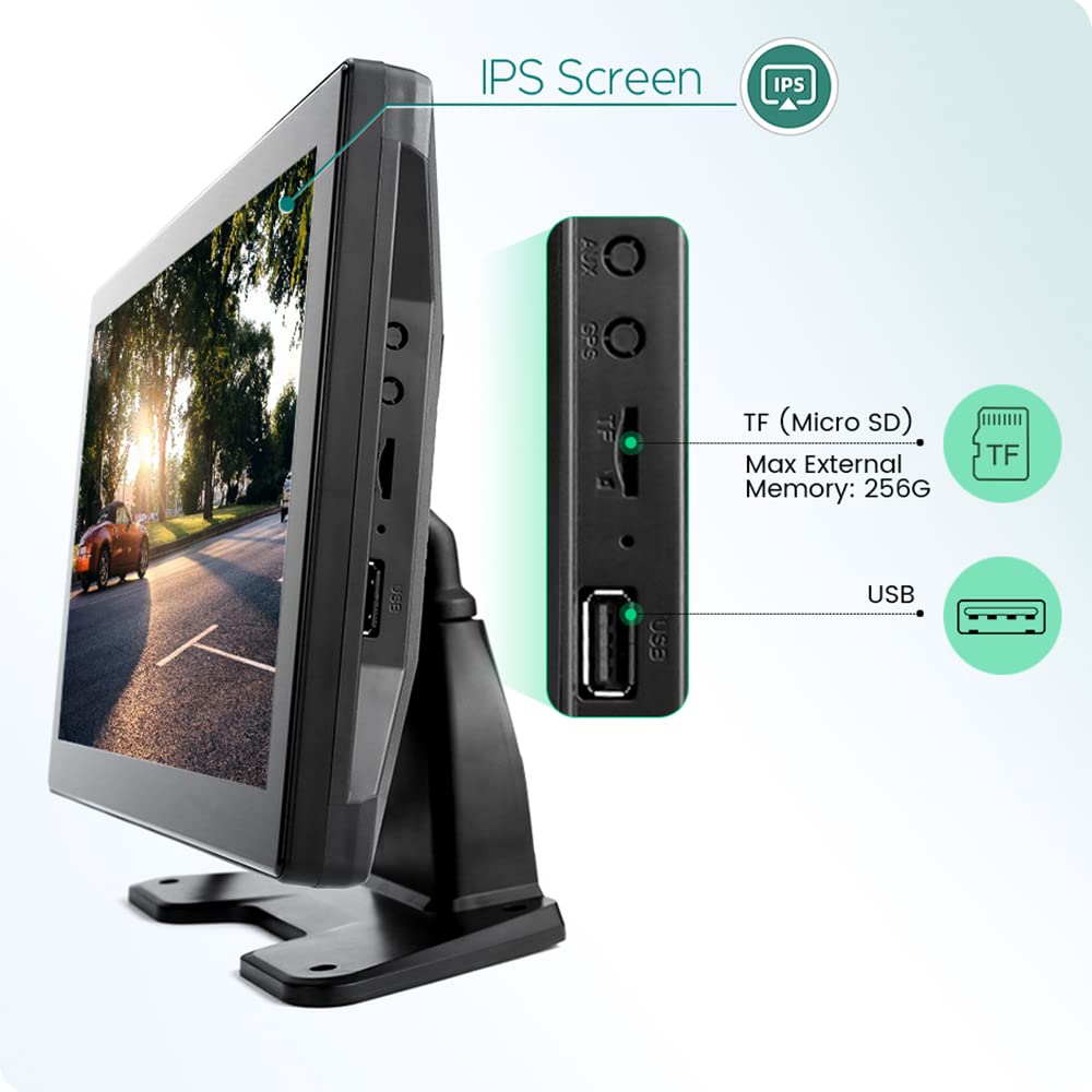 Ips Screen Excellent 178 Full-View Display Technology 178 Wider Viewing Angles Faster Response Times Better Color/Contrast Than Many Va And Tn Panels Outstanding Color Accuracy And Screen Consistency * Support To Play Music And Mp4 Video From Usb. Mirrorlink * Driver Can Use Applications From His Smartphone On A Monitor Screen. ( Only Support Android System ). * Just Connect The Usb Cable And Download The App Tcplay, You Can Transfer Data Between The Screen And Mobile Phone. Support Two-Way Interconnection, Also The Screen Can Give Power To The Mobile Phone When Turn On The Screen. Split Screen * Can Display 2 ~ 4 Screens At The Same Time * 10 Kinds Diy The Screen Display Mode, Can Show Front View, Rear View, Left View And Right View Separately Or Together. Loop Recording * Parking Video Recording And Playback, It Will Record The Parking Video In 24/7 Mode When You Are Not Inside Of The Car. The Storage Support Up To 256Gb. Automatically Overwrite The Previous Recordings With New Files When The Memory Card Is Full. * Adopt Time-Lapse Video Recording Technology, Save More Space And No Need To Format The Memory Card Often. (Note: Time-Lapse Video Recording Is Only Available During Parking Period, The Monitor Will Always Support Normal Video Recording During Driving.) * H.265 (Hevc) Doubles The Coding Efficiency Compared With Its Predecessor H.264. That Means It Saves More Storage Space, Store More Videos And The Videos Quality Are Smoother. Bluetooth-Compatible * The Monitor Can Connect To Your Mobile Phone Via Bluetooth. Support To Play Music And Mp4 Video From Usb And Mobile Phone. Ahd1080P Camera * With Ahd 1080P Camera Lens, The Quality Of Shooting Video Is Delicate And Clear Even In Low Light Conditions At Night