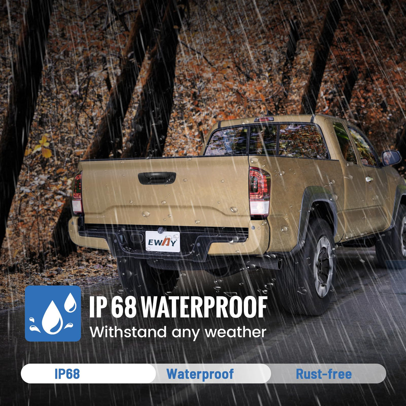 Q: What is the waterproof rating of the EWAY backup camera?A: The EWAY Tailgate Handle Backup Rear View Camera has an IP68 waterproof rating, ensuring it remains functional and durable in various weather conditions.
