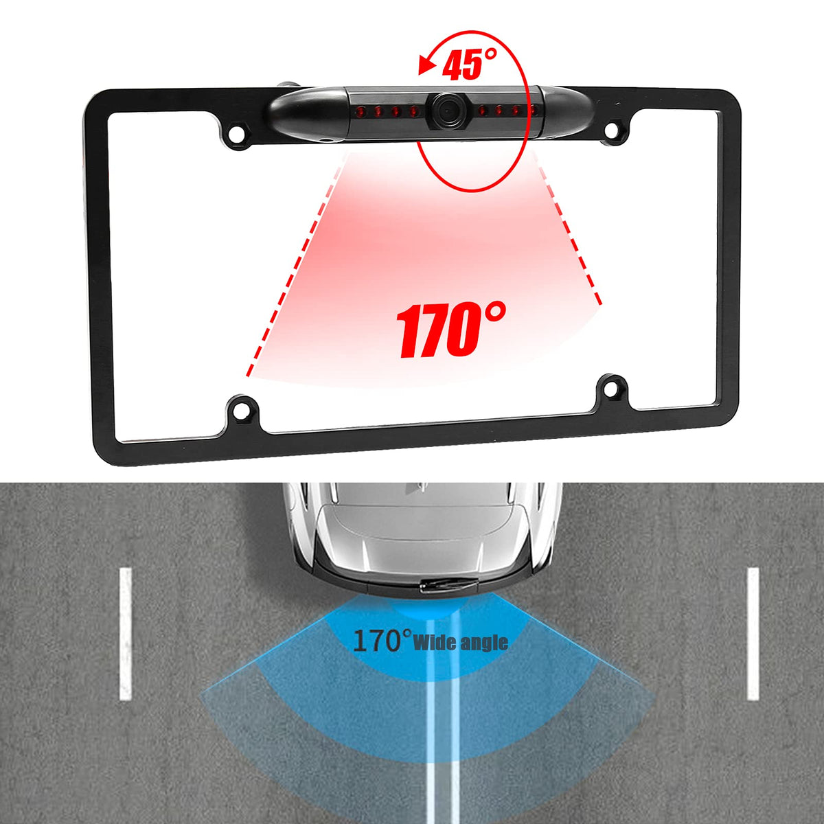 Q: What is the viewing angle of the License Plate Backup Camera?A: The License Plate Backup Camera features a 170° wide viewing angle, which helps eliminate blind spots and provides a comprehensive view when reversing.