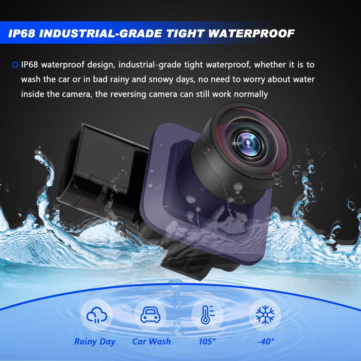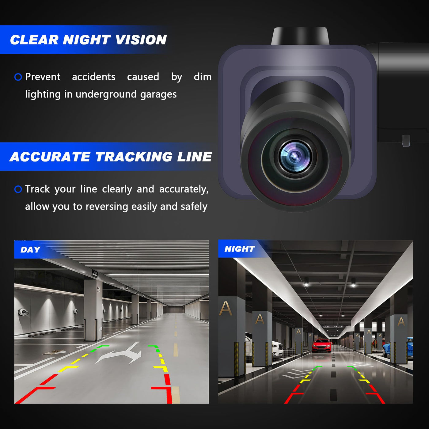 Q: What are the key features of the rear view backup camera?A: The camera features high-resolution imaging, HD color night vision, a 170° ultra-wide-angle view, waterproof construction (IP68), and precise tracking lines that assist in reversing safely.