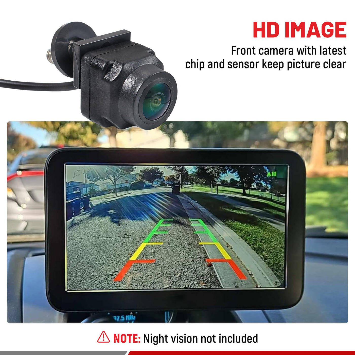 Q: How does the front-facing camera enhance off-road driving?A: The front-facing camera provides a 150° wide view angle, allowing drivers to see potential obstacles over the hood, such as rocks or unforeseen drop-offs. This feature aids in navigating challenging terrains safely.