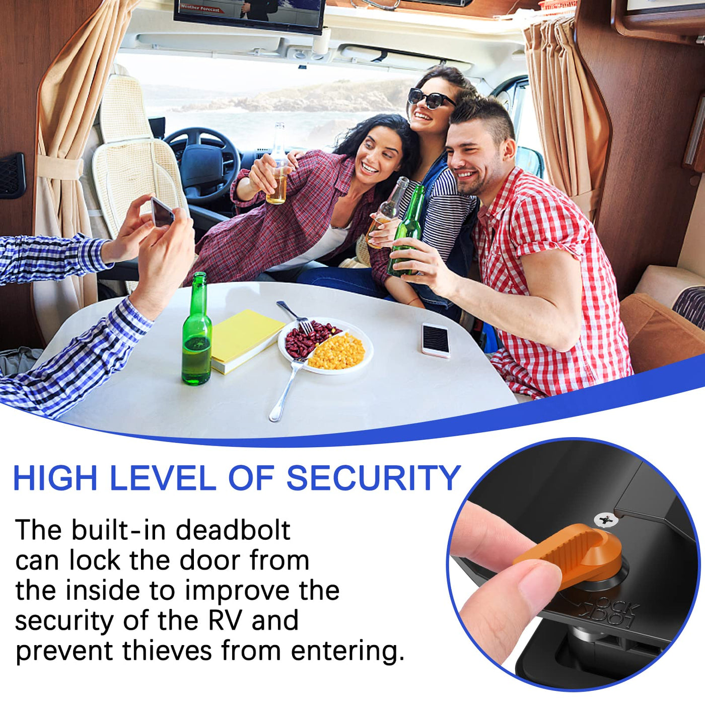 Waterproof Design: The lock has a waterproof construction that allows it to be used in wet environments. | Touch Activation: The lock is activated by touching the control, providing an easy and convenient way to access your trailer. | Deadbolt Mechanism: The lock uses a paddle deadbolt mechanism for added security and peace of mind. | Compatible with RVs: The lock is specifically designed to fit RVs and travel trailers. | Made from Durable Materials: The lock is made from zinc, plastic, and aluminum materials that are built to last.