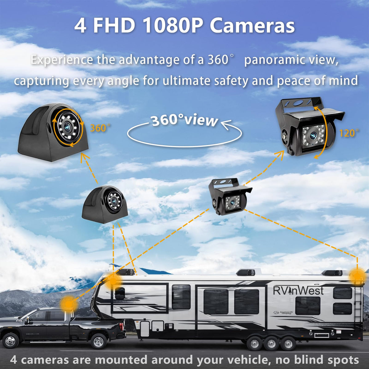 Q: What is the resolution of the monitor and cameras in this system?A: The RVInWest Backup Camera System features a large 9-inch monitor with a full HD resolution of 1080P. The cameras also provide 1080P resolution, ensuring sharp, clear images for both rear and side views, enhancing your overall driving safety.