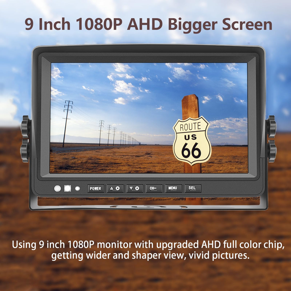 Backup Camera System With 9 Large Monitor And Dvr For Rv Semi Box Truck Trailer Rear & Side View Quad Hd Camera 4 Split Screen Advanced Record Function Ip69 Waterproof Avoid Blind Spot ?Backup Cameras System For Rv Truck Tractor Trailer. Reversing Camera Rear View Camera Parking Camera Side View Camera System. ?Designed Specially For Rv Truck Box Truck Semi Truck Trailer Travel Trailer Bus Heavy Duty Camper Tractor, The 5Th Wheel,Motor Homes. Using Wide Voltage Power Input 12-24V Dc. Support To Mirror Image And Rotate Image. ?Built-In Dvr : Great Recording Function Dvr Supports To Record 4 Channels Camera At The Same Time And Loop Recording. Saving The Video Automatically So We Can Find The Video Easily If We Need ?Hd Cameras & Large 9 Monitor: Large 9 Inch Ahd Monitor, Full Hd 4 Cameras And 4 Split Screen, Ccd Sensor Help This Rv Cameras System To Get A Extreme Crystal Clear Image And Notice Everything Surrounding Us, Avoid The Blind Spot. Drive With A Pleasant Mood And Make Our Driving 100% Safe With This Camera System For Rv Travel Trailer Truck Etc. ?Additional Function: Ip69 Waterproof Camera Works Great In Rainy/Snowy/Hot Weather. Protection Technology For Power Failure To Protect This System. Arm Dsps High Speed Processor Makes Night Vision Vision Better. Humanized Built-In Linux Operating System Help Us To Operate More Conveniently. Specification: Rear Front Side View Cameras: ? Waterproof Level: Ip69 ? Ir Infrared Led Light: 18 Pcs (Square Camera) + 10 Pcs (Dome Camera). ? Power: 12-24V Dc. ? Lens Angle: 170. ? Resolution: 1080P. Quad View Monitor: ? Display Resolution: 1080P. ? Power Supply: Dc 12V-24V. What You Can Get: ? 9 Inch 1080P Quad View Monitor X 1.? Rear View Camera X 2.? Side View Camera X 2.?? 33Ft Av Cable X 2.? 66Ft Av Cable X 1.? Other Kit X 1.? 1 Year Quality Warranty And Free Replacement.