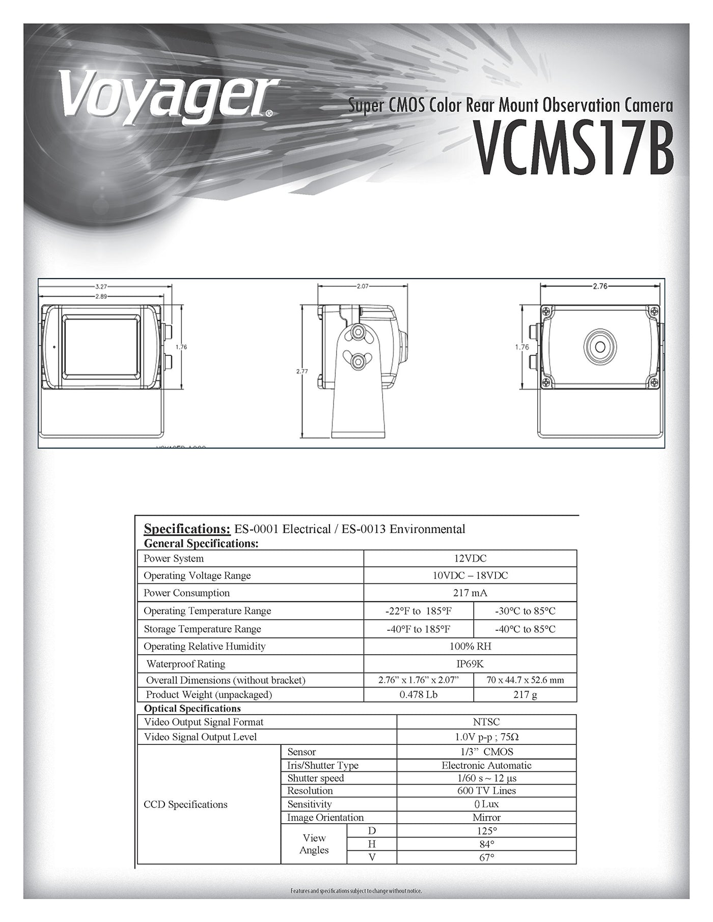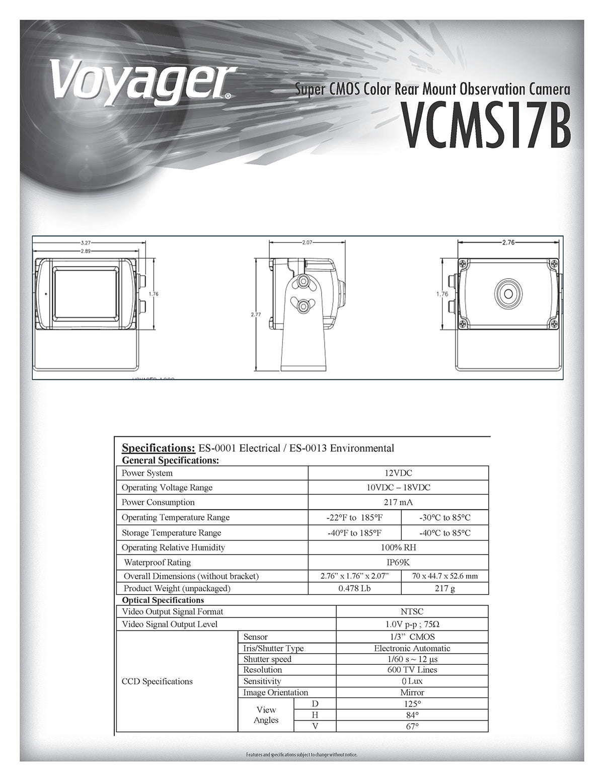 Q: What are the dimensions of the Voyager VCMS17B camera?A: The dimensions of the Voyager VCMS17B camera are 2.76 inches in width, 1.76 inches in height, and 2.07 inches in depth, making it compact and easy to install in various locations.