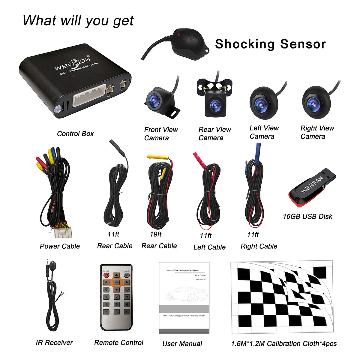 Main Feature: 1. Perfect Bird View (Aerial View, Round View, Or Panoramic View) Of The Car Surroundings 2. 4 Channel Recording From The 4 Cameras Brief Of The Recording Function: 1. The System Will Automatically Start Recording When The Engine Is On, With Loop Recording For Every 5 Minutes. For A 32Gb Memory, It Can Record 8Hours. 2. When The Car Is Ignited And The Monitor Doesn'T Show The Video From The Cameras, The System Will Record In The Background. The Bird View And The Front View Will Be Recorded. 3. When The Car Is Ignited And The Monitor Is Showing The Video From The Cameras, All The Scenes Displayed On The Monitor Will Be Recorded. (It Could Be The Bird View And One View Of Left, Right, Front, Or Rear View). 4. There Will Be An Usb Interface With The System Which Can Be Used To Connect A Pc To Copy Data From The Tf Card. Note: Please Comfirm That There Is A In-Dash Monitor Or Other Lcd Monitor Which Can Input And Display A Pal Or Ntsc Video(Rca Interface) In Your Car. The Video Output Of This Product Only Fit For The Monitors Which With Rca Interface, Please Check Your Car'S Monitor Carefully. (Generally, The Video Input Interface Of ''Original Car Monitor'' Is Lvds Or Other Else. And The Car Monitor(Dvd, Gps Navigation) Which You Bought Separately Has A Rca Interface). If Your Monitor Don'T Have Rca Interface, You Need A Video Decoder. Packing List: Control Box X 1 Camera X 4 Infrared Receiver X 1 Power Cable X 1 Extension Cable Of Camera X 4 Calibration Cloth X 4 Remote Control X 1(Without Battery Due To Airline Limitation) (Not Includes The Monitor)