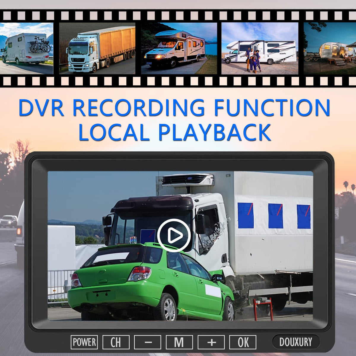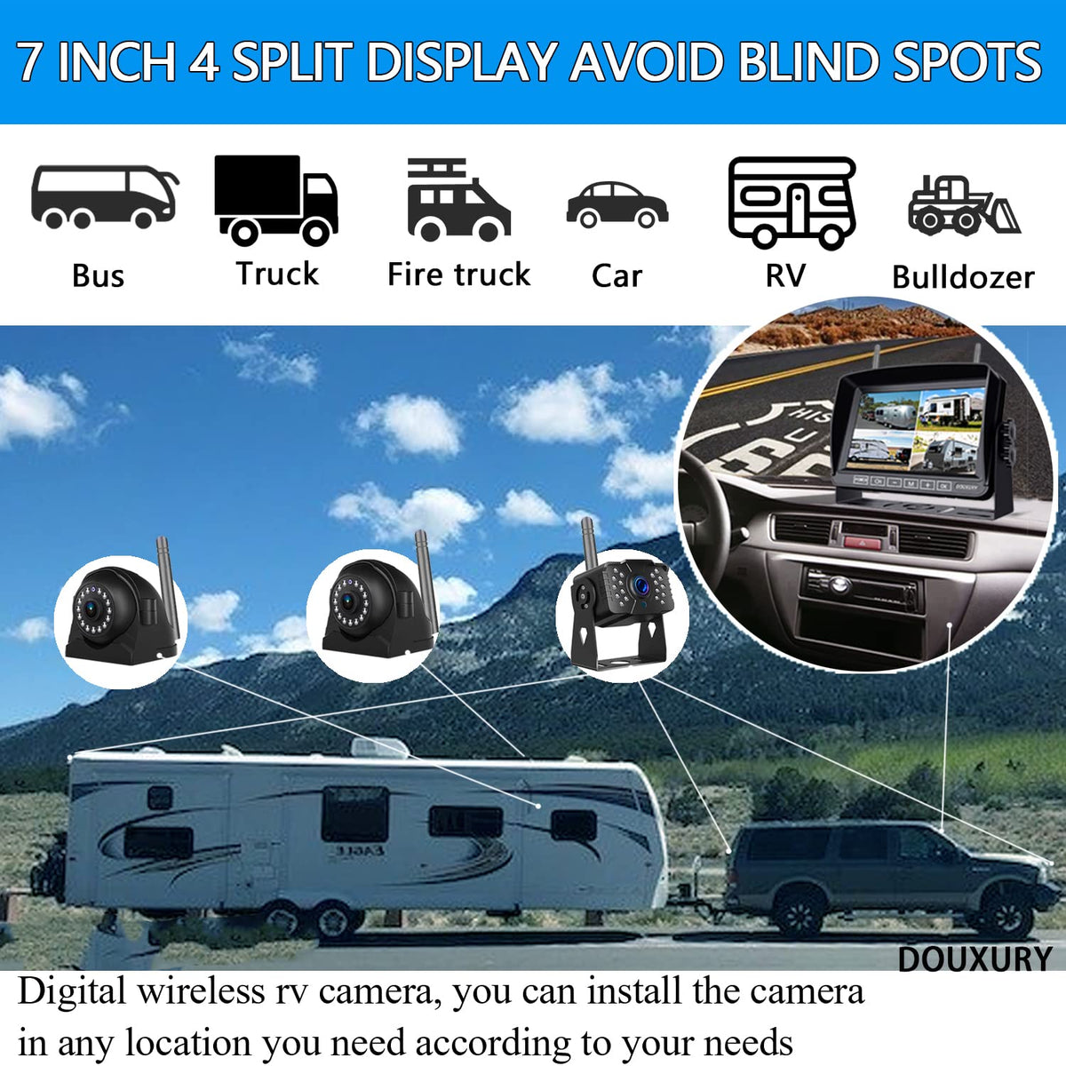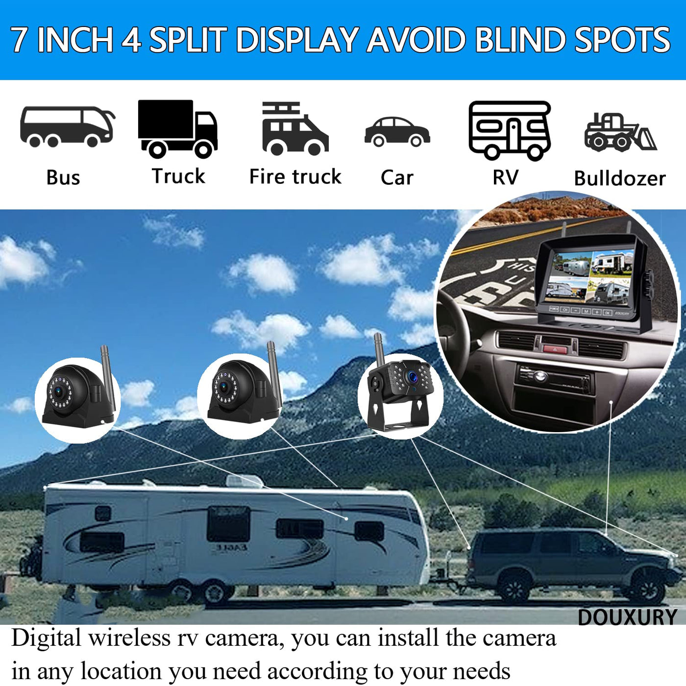 Douxury Wireless Rv Backup Camera + 7'' Rear View Display System For Rv Cars Truck Pickup Trailer Camper Bus Rv 5Th Wheel Why Is Douxury Worth Your Choice? ? Rear View And 2 Side View Cameras: The Latest Sealing Tech With All Metal Cover, To Ip69 Waterproof Level. ? Great Product: The Wireless Backup Camera System Is The 2024 Latest Version, With 1080P Hd Pictures, Stronger Wireless Signal And Better Ip69 Waterproof Level . ? Quality Guarantee: We Promise To Replace The Defective Or Missing Part For Free. Easy To Install: Detailed Installation Manual Book Is Included In The Package, You Can Handle The Installation Yourself. 1. Install The Backup Camera Connect The Backup Camera With The Running Lights/Reversing Lights To Give The Camera 12-36V Dc Power Notice: Simply Connecting The Black Power Wire From The Camera To Any Metal Part Of The Vehicle May Cannot Power The Camera Successfully. 2. If You Need Any Help During Using And Installation, Please Contact Us First, We Will Do Our Best For You. 3. Install The Monitor Use The Cigarette Lighter Adapter To Connect The Monitor With The Cigarette Lighter. 7Inch Backup Monitor: ? Screen: Lcd Tft. ? Resolution: 1080P. ? Size: 7 Inches. ? Power Supply: 12V-36V Dc. Rear View Camera: ? Waterproof: Ip69. ? Power Supply: 12-36V Dc. ? Night Vision: 18Pcs Ir Leds. Two Side View Cameras: ? Waterproof: Ip69. ? Power Supply: 12-36V Dc. ? Night Vision: 15Pcs Ir Leds. Package List: ? 7 Inches Hd Monitor X 1. ? Rear View Cameras X 1. ? Side View Cameras X 2. ? Sunshade For Monitor X 1. ? Monitor Stand Bracket X 1. ? ''U'' Shape Monitor Bracket X 1. ? Cigarette Lighter Adapter X 1. ? Power Cord X 4. ? Antenna X 5 (Including A Spare Antenna). ? Detailed Manual Book X 1. ? Other Accessories X 1 Set.