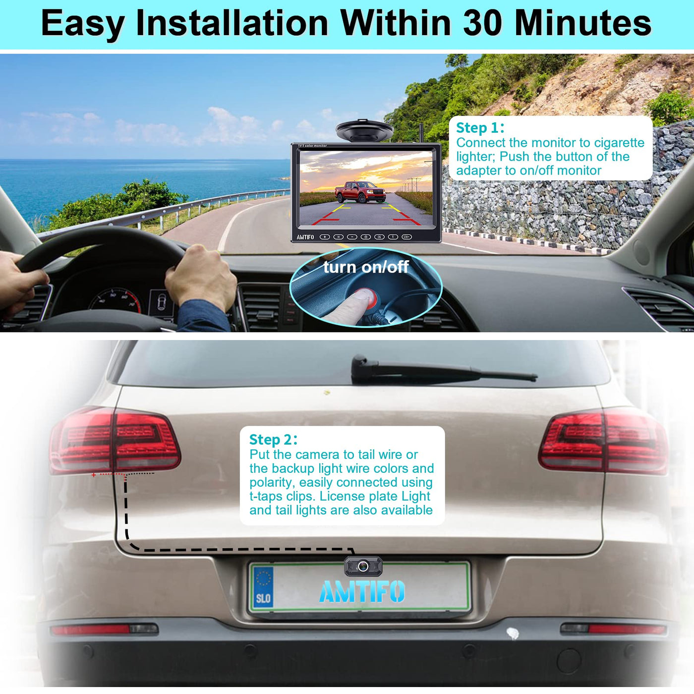 Q: How easy is it to install the Wireless Backup Camera for Truck Car?A: The Wireless Backup Camera for Truck Car is designed for easy installation, allowing you to set it up within 20-30 minutes. There is no need for a wired connection between the camera and the monitor; simply connect the monitor to your vehicle's lighter charger and the camera to the running or reversing light.