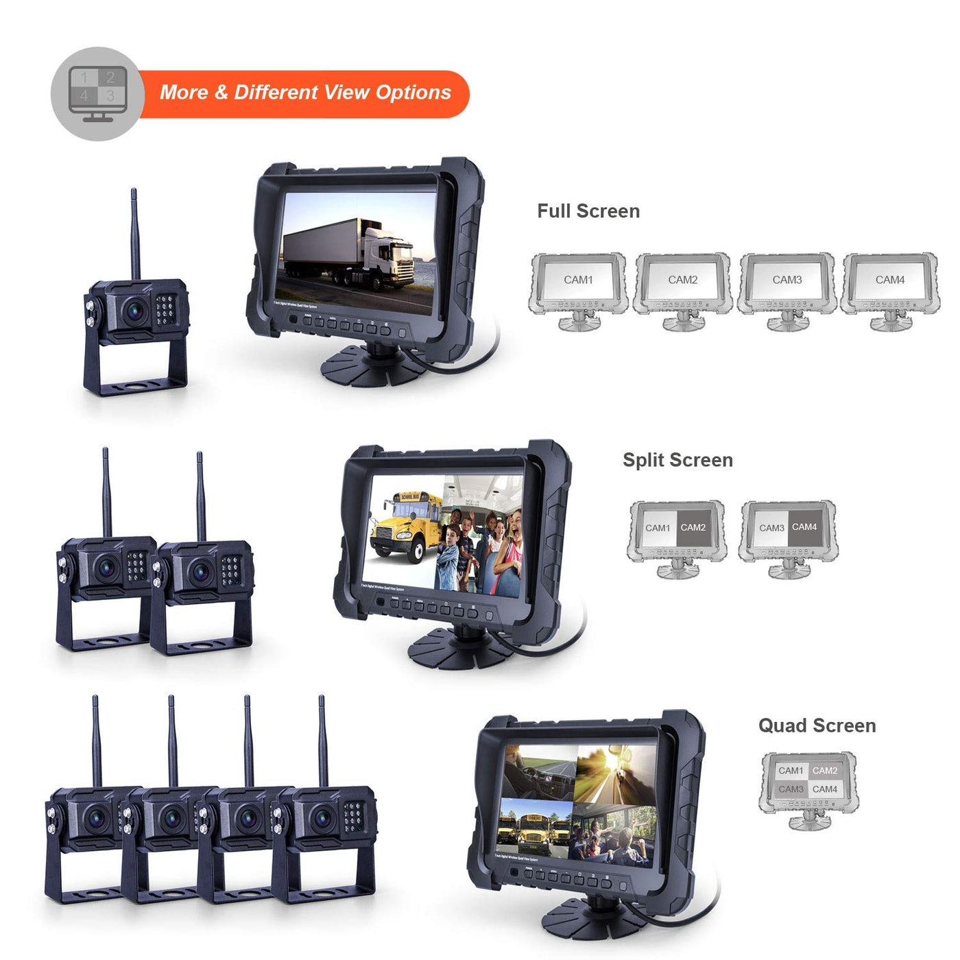Q: What features does the Yuwei Digital Wireless Backup Camera System offer?A: The Yuwei Digital Wireless Backup Camera System features two Full HD 720P wireless reverse cameras, a user-friendly 7-inch monitor with a wide viewing angle, and supports both single and quad camera views. It also includes infrared night vision, IP69k waterproof rating, and a long transmission distance of up to 300 meters.
