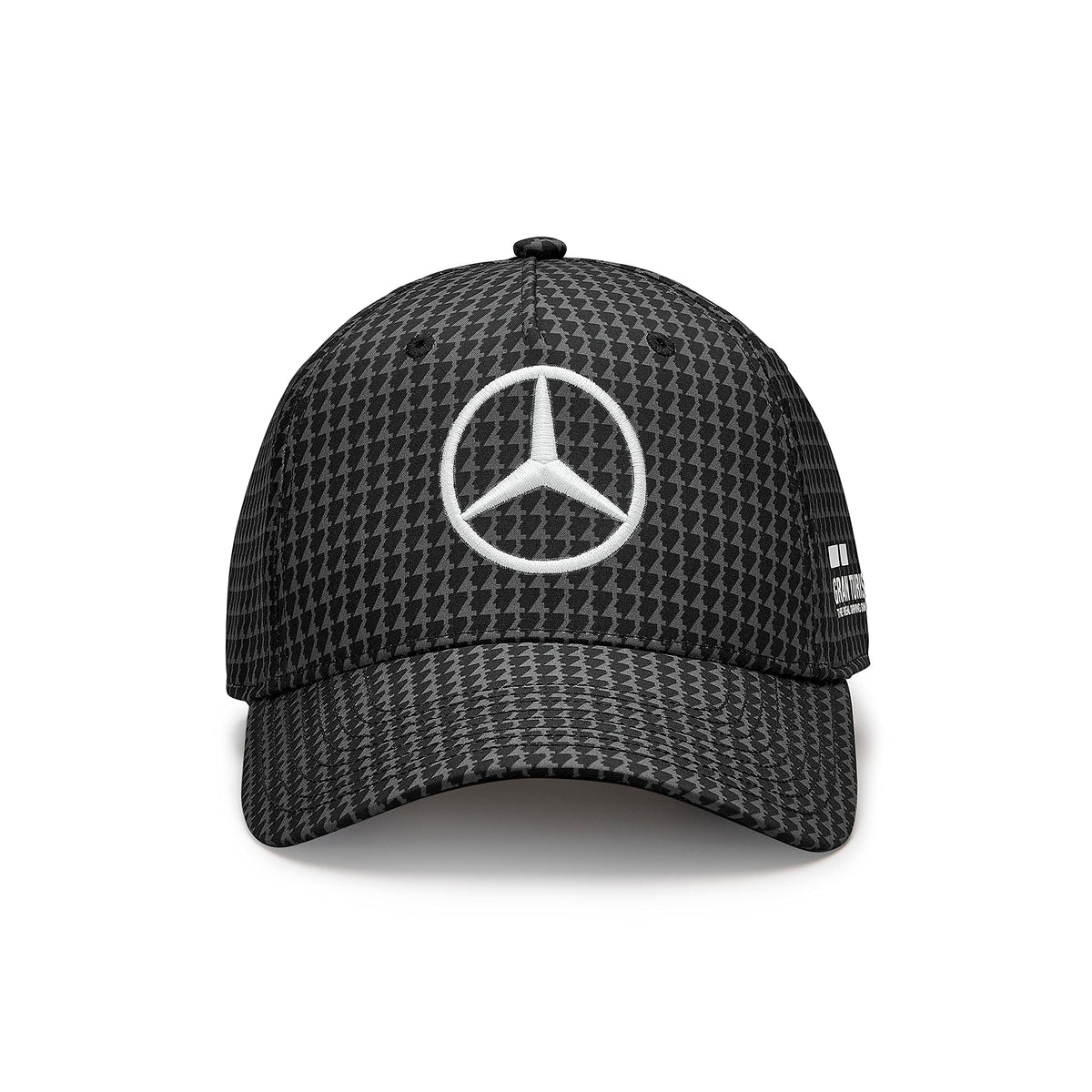 Q: What distinguishes this hat from other racing apparel?A: This hat features a unique '44' houndstooth print, embroidered Mercedes star logo, and printed sponsor branding, making it a standout accessory for fans of Lewis Hamilton and the Mercedes AMG Petronas Formula One Team.