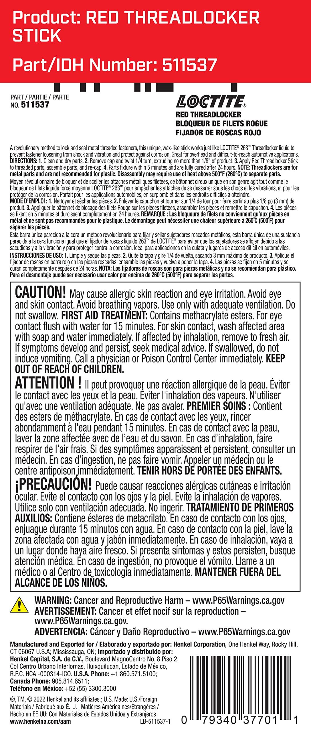 Convenient, Portable & Effective Formulated As Wax-Like, Semi-Solid Adhesives Packaged In A Self-Feeding Stick Applicator, Loctite Red Threadlocker Stick Provide Robust Cure Even On Oil-Contaminated Or Inactive Metals Like Stainless Steel. Invented By Henkel As A Revolutionary Method To Positively Lock And Seal Threaded Fasteners, Loctite Threadlocker Adhesives Are Used In A Wide Range Of Applications From Delicate Fuel Injection Components To Heavy-Duty Transmission And Engine Assemblies. Specified By Automotive Oem'S And Approved For Use On Factory Assembly Lines, Threadlockers Work By Filling The Spaces Between Threads. The Result Is A Secure, One-Piece Assembly That Will Not Loosen Under Stress. Wont Drip, Leak Or Melt! Perfect For Overhead Applications These Convenient And Portable Products Will Not Leak Or Drip When Carried In A Pocket, Stored In A Toolbox Or Used In An Overhead Application. The Sticks Are Designed And As Easy To Use As Henkels Well-Known Pritt Sticks For Consumers. Loctite Threadlocker Sticks Deliver The Same Proven Performance As The Well-Known Liquid Loctite Threadlockers: They Secure Threaded Assemblies, Fill Gaps Between Threads, And Prevent Loosening, Leaks And Corrosion. Removable With Hand Tools Loctite High Strength Red Threadlocker Stick Is Applied To A Threaded Fastener And Can Be Disassembled Using Applied Heat And Hand Tools. This Anaerobic Adhesive Is Great For Automotive And Other Applications Where Resistance To Heavy Shock, Vibration And Stress Levels Is Required; Such As Air Tools, Cylinder Block Bolts, Ring Gear Bolts, Transmission Shaft Bolts & More. The Product Works On All Metals, Including Passive Substrates Such As Stainless Steel, Aluminum And Plated Surfaces. It Is Proven To Be Tolerant Of Minor Contamination Due To Industrial Oils, E.G., Motor Oils, Corrosion Prevention Oils And Cutting Fluids. With The Same Convenient Packaging As The Medium Strength Loctite Blue Stick Threadlocker, This High Strength Threadlocker Is Better Suited For Heavy-Duty Applications Where Resistance To Heavy Shock, Vibration And Stress Levels Is Required. Localized Heating And Hand Tools Are Required To Separate Parts. Loctite Automotive Aftermarket Products Are Not Just Oem-Specified, They Are Also Designed By Auto Manufacturers And Lab Tested. Engines Of Nearly Every Professional Race Car Are Assembled And Maintained With Loctite Brand Adhesives, Sealants, Gasket Makers, And Coatings. Whether Gasoline Or Diesel, From Bolts And Gaskets To Cooling Lines And Core Plugs, Henkel Products Are Used To Seal, Secure, And Repair Vehicle Components.