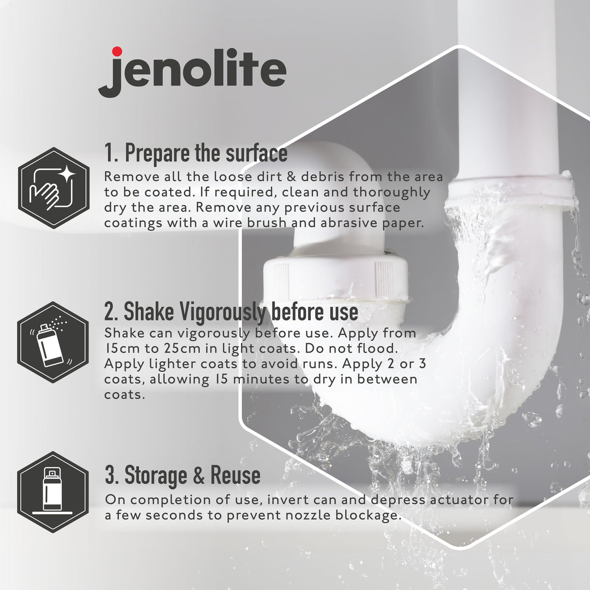 Q: What surfaces can JENOLITE Stop Leak Sealer Spray be used on?A: JENOLITE Stop Leak Sealer Spray is designed for multi-surface use, making it suitable for application on plastic, wood, metal, ceramic, concrete, roofing felt, guttering, and drainpipes.