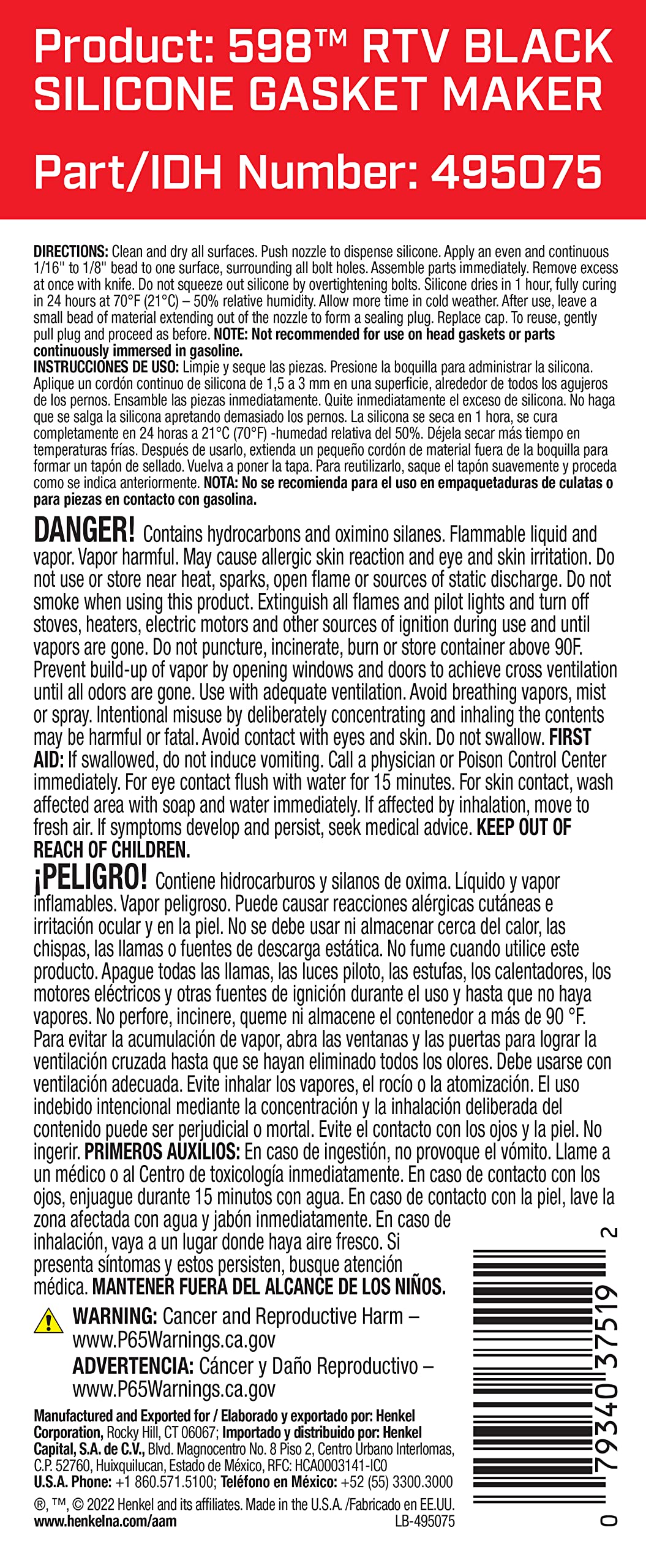 Loctite Black Rtv 598 High-Performance Silicone Is For Dealership Warranty Requirements And Ensures Extended Drivetrain Warranty Compliance. Fast-Curing Formula. Sensor-Safe, Low Odor, Noncorrosive. Meets Performance Specs Of Oe Silicone Gaskets. Retains High Flexibility, And Oil Resistance Properties. Temperature Range: -75F To 625F (-59C To 329C) Intermittent; Resists Auto And Shop Fluids And Vibration.Loctite Automotive Aftermarket Products Are Not Just Oem-Specified, They Are Also Designed By Auto Manufacturers And Lab Tested. Engines Of Nearly Every Professional Race Car Are Assembled And Maintained With Loctite Brand Adhesives, Sealants, Gasket Makers, And Coatings. Whether Gasoline Or Diesel, From Bolts And Gaskets To Cooling Lines And Core Plugs, Henkel Products Are Used To Seal, Secure, And Repair Vehicle Components.
