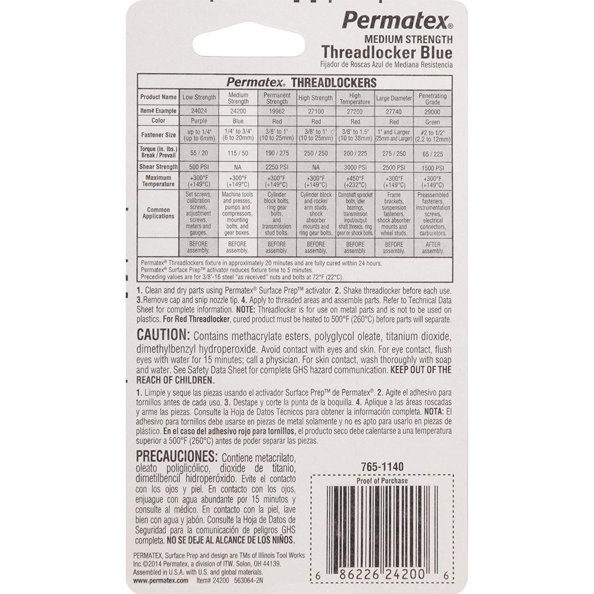 Permatex Medium Strength Threadlocker Blue Formula Is An All-Purpose Threadlocker Ideal For All Nut And Bolt Applications 6Mm To 20Mm. Eliminating The Need For Stocking Expensive Lock Nuts And Lock Washers, This Threadlocker Locks And Seals While Preventing Parts Loosening Due To Vibration. It Also Protects Threads From Corrosion And Is Removable With Hand Tools For Easy Disassembly. Applied As A Liquid Or Gel, Threadlockers Are Superior To Conventional Lock Washers, Nylon Inserts, And Other Mechanical Devices Because They Secure The Entire Fastener Assembly Against Loosening From Shock And Vibration By Filling The Space Between Threaded Metal Parts, Curing To Form A Tough, Adhesive Bond And Seal. They Also Seal The Threads Against Leakage, Preventing Rust And Corrosion.