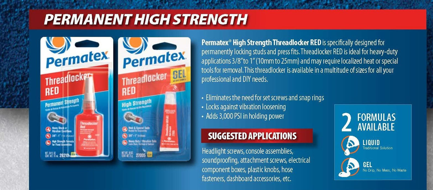 Permatex High Strength Threadlocker Red Formula is ideal for heavy-duty applications 10mm to 25mm and is especially well-suited for permanently locking studs and press fits. This high strength threadlocker adds 3,000 PSI holding power on slip and press fit assemblies and replaces set screws and snap rings. It also locks against vibration loosening. May require heat or special tools for removal. Applied as a liquid or gel, threadlockers are superior to conventional lock washers, nylon inserts, and other mechanical devices because they secure the entire fastener assembly against loosening from shock and vibration by filling the space between threaded metal parts, curing to form a tough, adhesive bond and seal. They also seal the threads against leakage, preventing rust and corrosion.