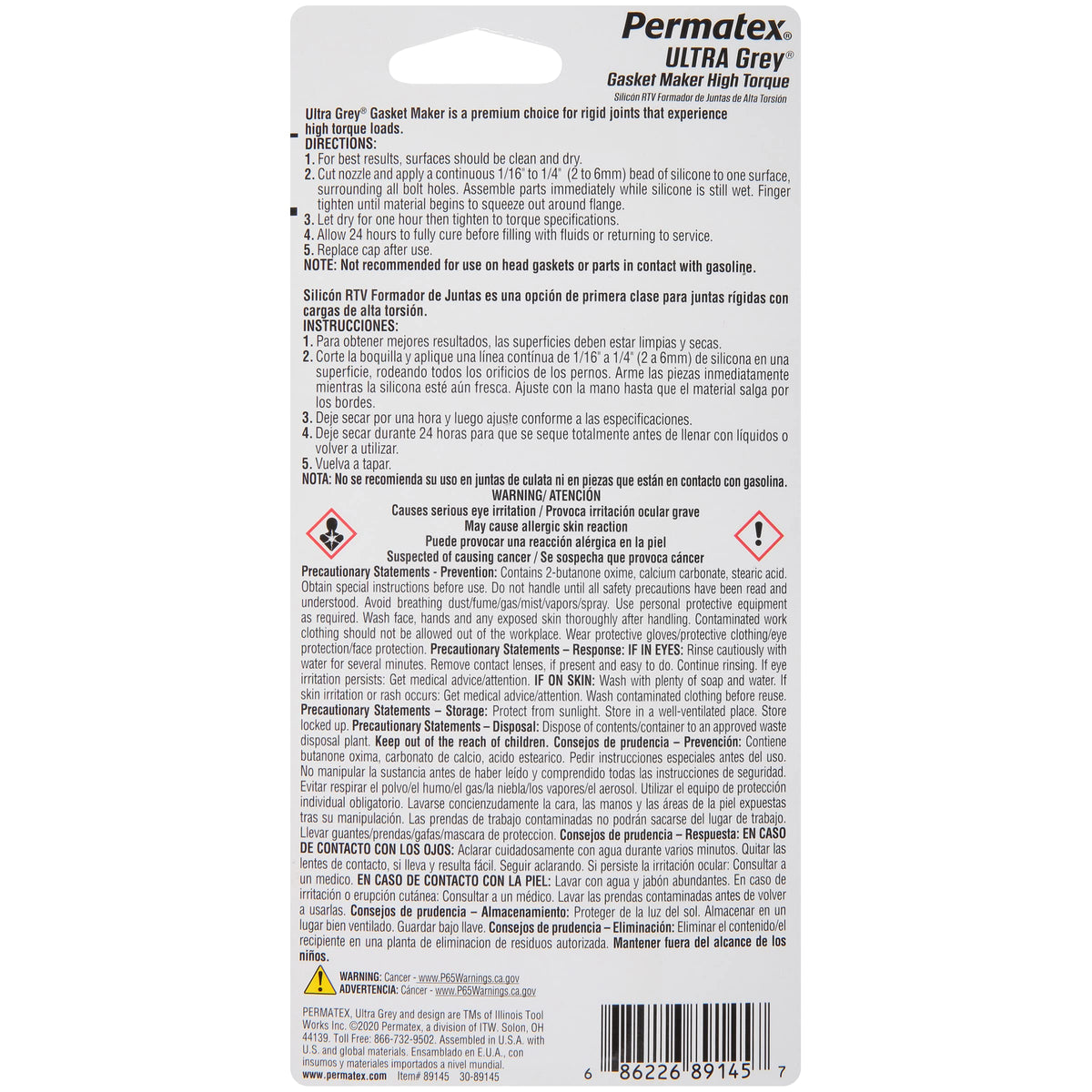 Rtv Gasket Maker, Color Gray, Container Size 3.5 Oz, Container Type Tube, Full Cure Time 1 Day, Cure Type Room Temperature, Maximum Gap Fill Size 0.25 In, Maximum Operating Temperature 450 Degrees F, Minimum Operating Temperature -65 Degrees F, Series Ultra Grey Rigid Rtv, Working Time 1 Hr, Product Form Paste, For Fluid Type Anti-Freeze Solution, Automotive Fluids, Alcohol, For Material Type Aluminum, Brass, Glass, Iron, Plastic, Steel, Stone, Wood