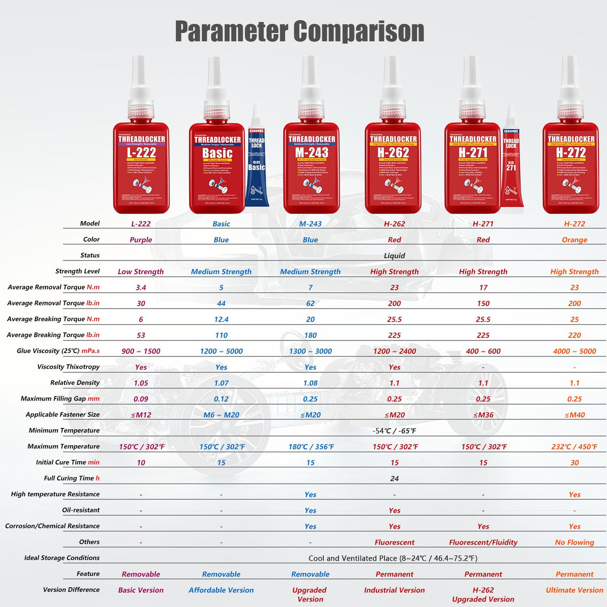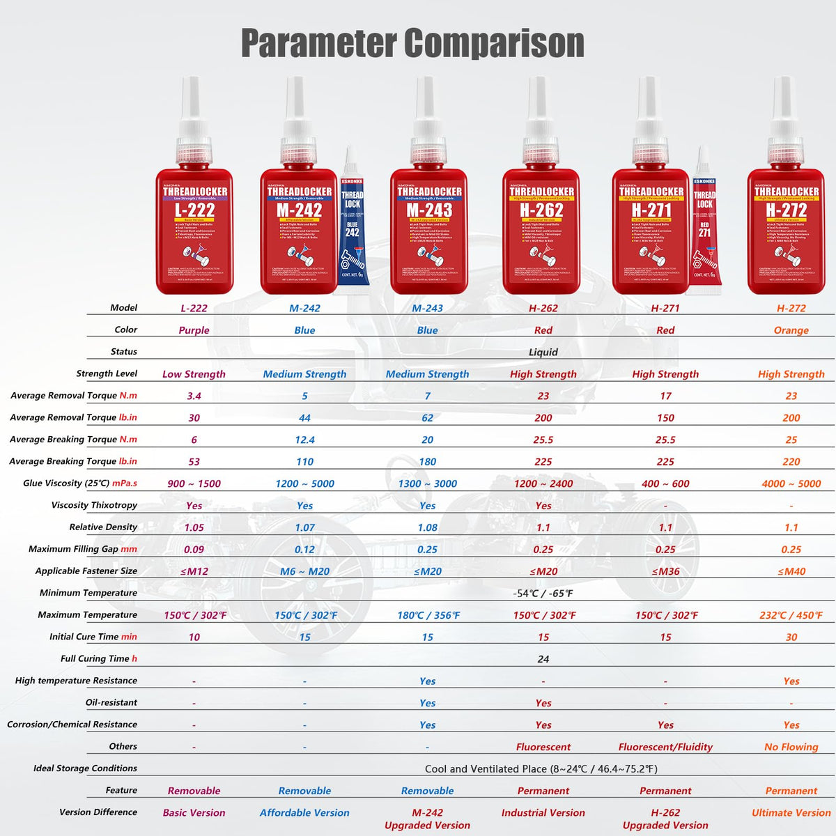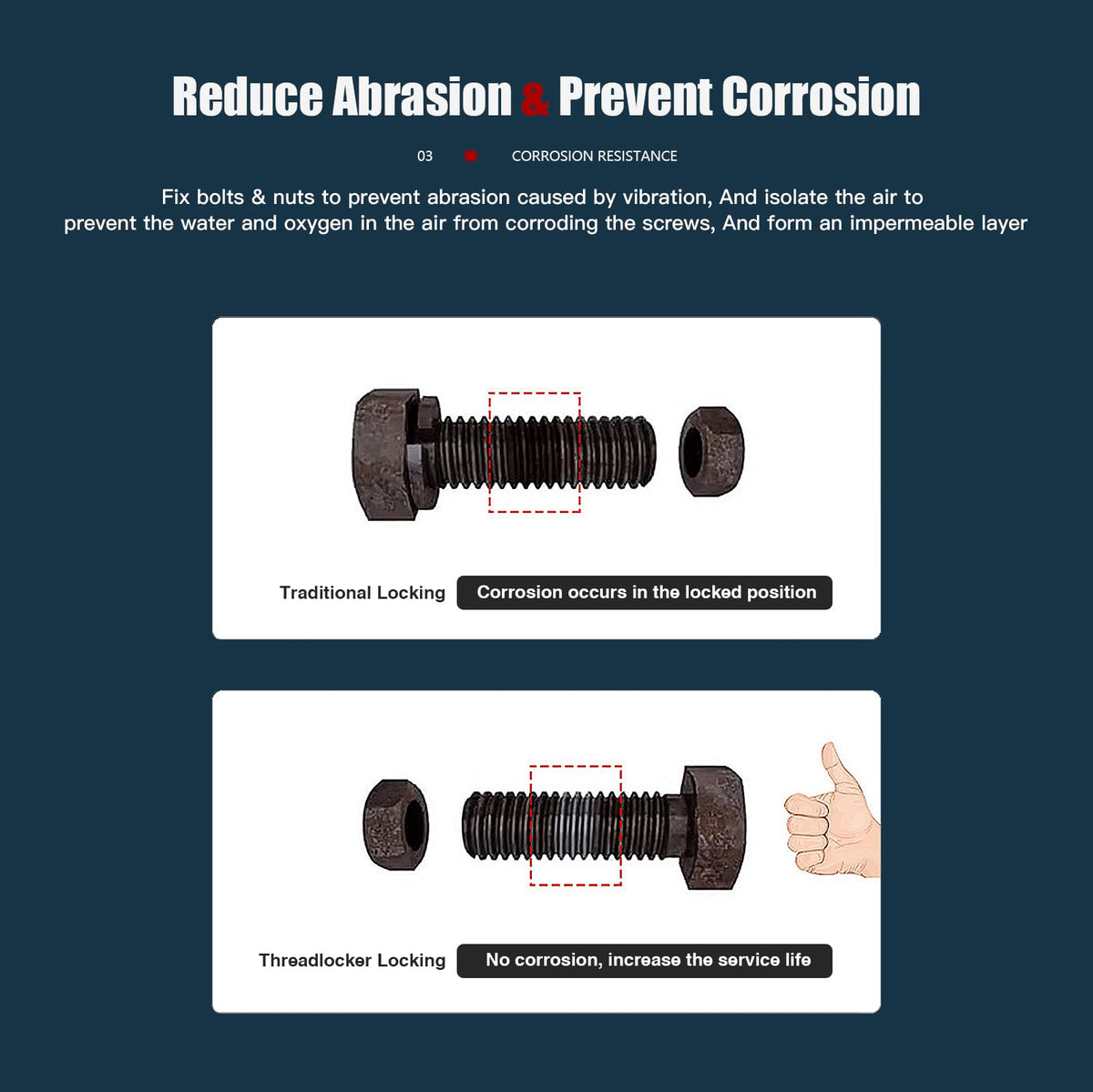 Please shake it before use to ensure the composition is even; Please make sure the parts used are clean, dry and free of oil; This product needs to be in full contact with air to prevent solidification. So there is only half of the liquid in the bottle; This product is suitable for Bolts = M40. The extra-large size bolts will affect the curing speed and strength due to the excessive thread gap; This product is not suitable for use in pure oxygen or oxygen-rich environment, nor can it be used as a sealing material for hydroxide substances; This product is not suitable for plastic bonding and fixing, please be familiar with the applicable material range of this product; After use, please seal it immediately to avoid volatilization of the active ingredients; Do not pour back unused glue to avoid contamination of the original glue; Please store it in a cool place to avoid sun exposure and high temperature environment, Too high or too low temperature will affect product performance.; It can increase the torque-tension ratio. User experience will be affected if the torque-tension ratio exceeds the applicable range.