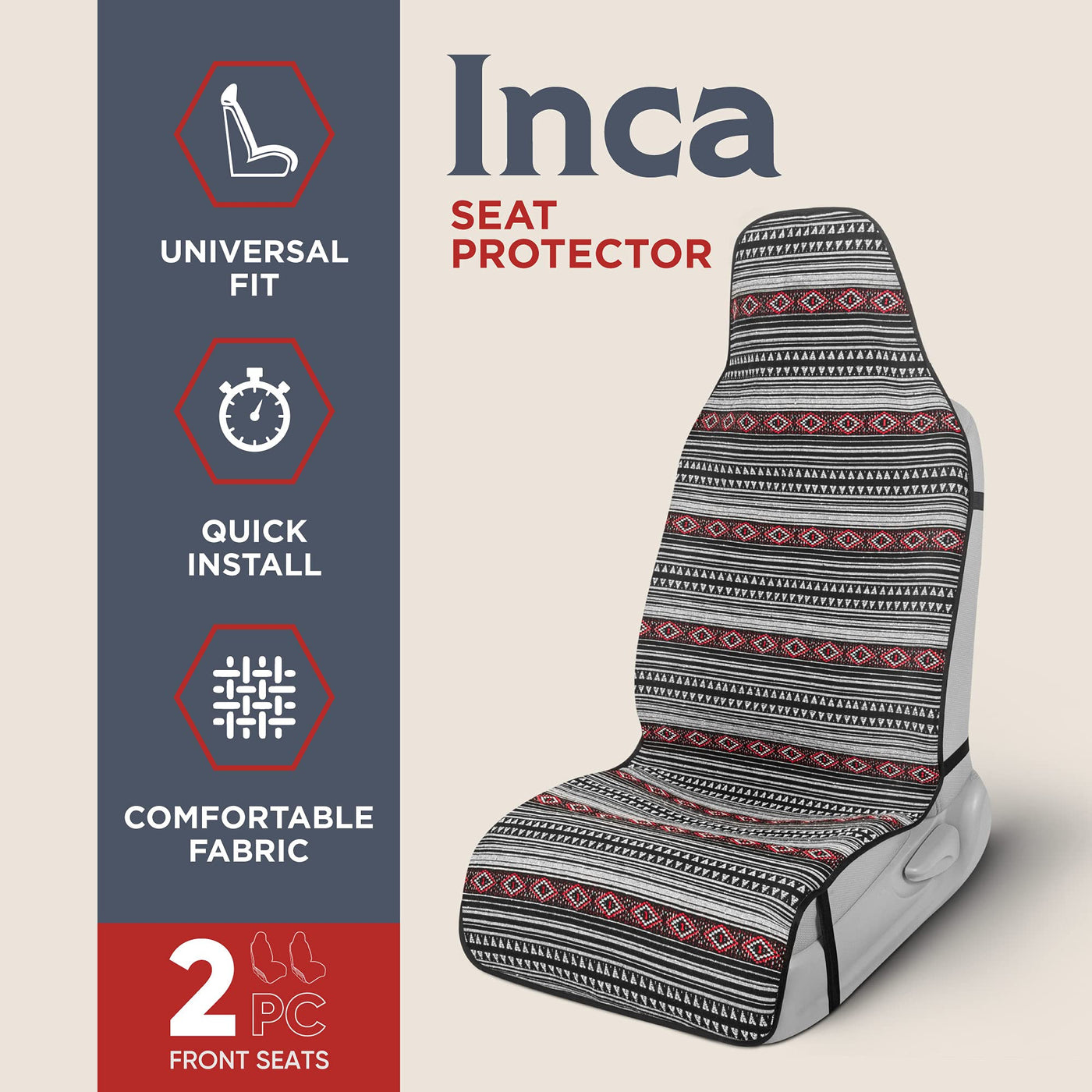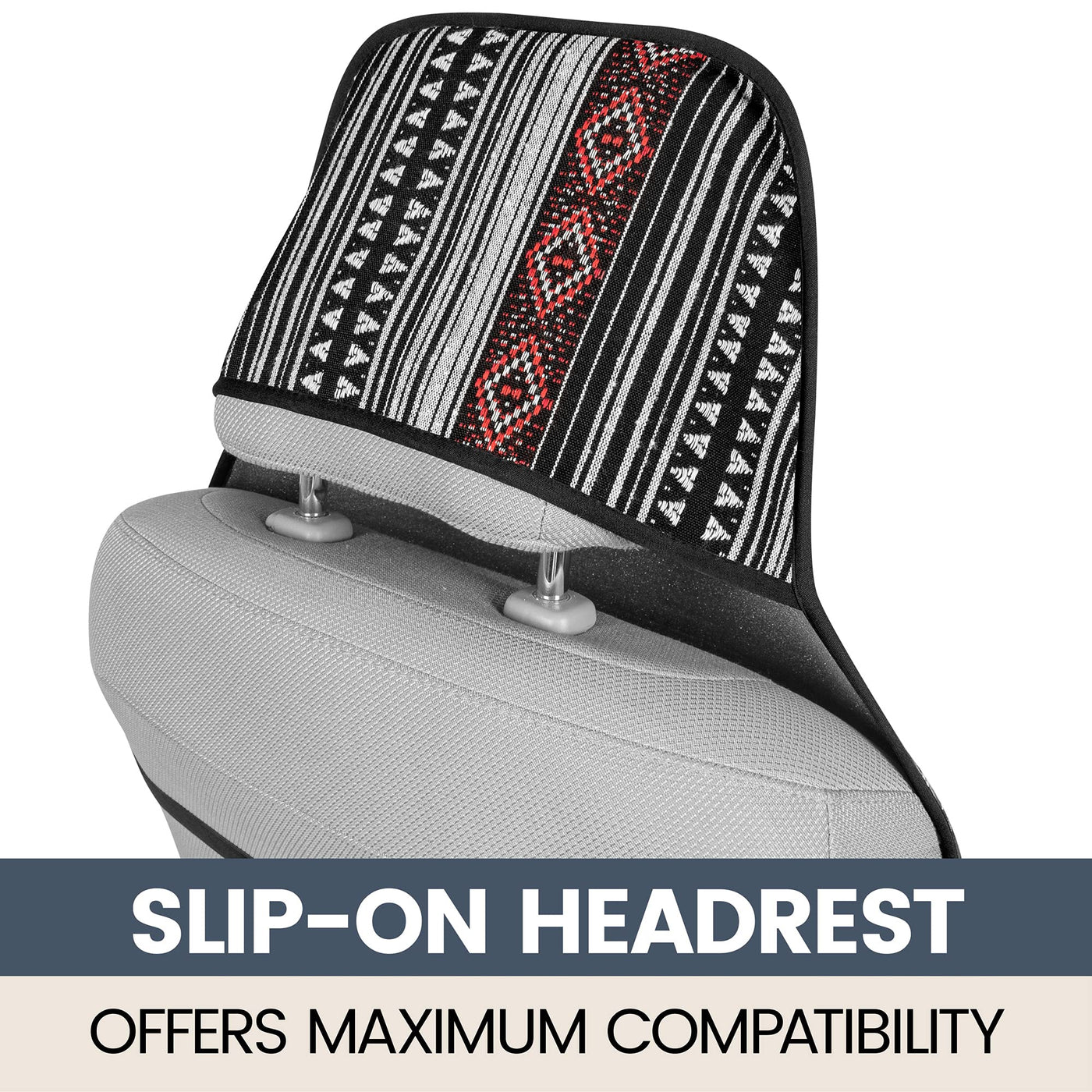 Baja Style Woven Saddle Blanket Car Seat Covers:These woven car blanket seat covers are the perfect way to infuse your vehicle with bold, Southwestern flair while offering excellent protection and comfort. These seat covers are inspired by the traditional patterns and vibrant colors of Mexican and Aztec designs, bringing a unique cultural touch to your car's interior. The geometric patterns, rich in earthy tones such as deep reds, blues, and oranges, evoke the beauty of the desert landscapes and the rich cultural heritage of Mexico and the American Southwest.Crafted from high-quality, durable materials, these saddle blanket seat covers for trucks and car seat covers are designed to withstand the rigors of everyday use and they provide superior protection for your car seats against dirt, spills, and wear. The woven fabric is not only tough and long-lasting but also soft and comfortable, ensuring a pleasant driving experience.Ideal for those who love adventure and the outdoors, these saddle blanket truck seat covers are perfect for beach trips, camping, or off-road adventures. They are designed to withstand the challenges of an active lifestyle, protecting your car from sand, dirt, and moisture while making your interior stand out. The ease of cleaning makes them even more convenient - simply wipe down the fabric to keep it looking fresh.Whether you drive a car, truck, or SUV, the Mexican Aztec Baja style car seat covers add both functionality and personality to your ride. Their rugged durability, vibrant design, and easy maintenance make them a must-have for anyone looking to combine style with practicality. Embrace the spirit of adventure while keeping your cars interior protected and looking amazing!