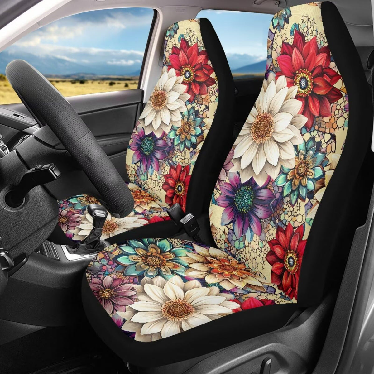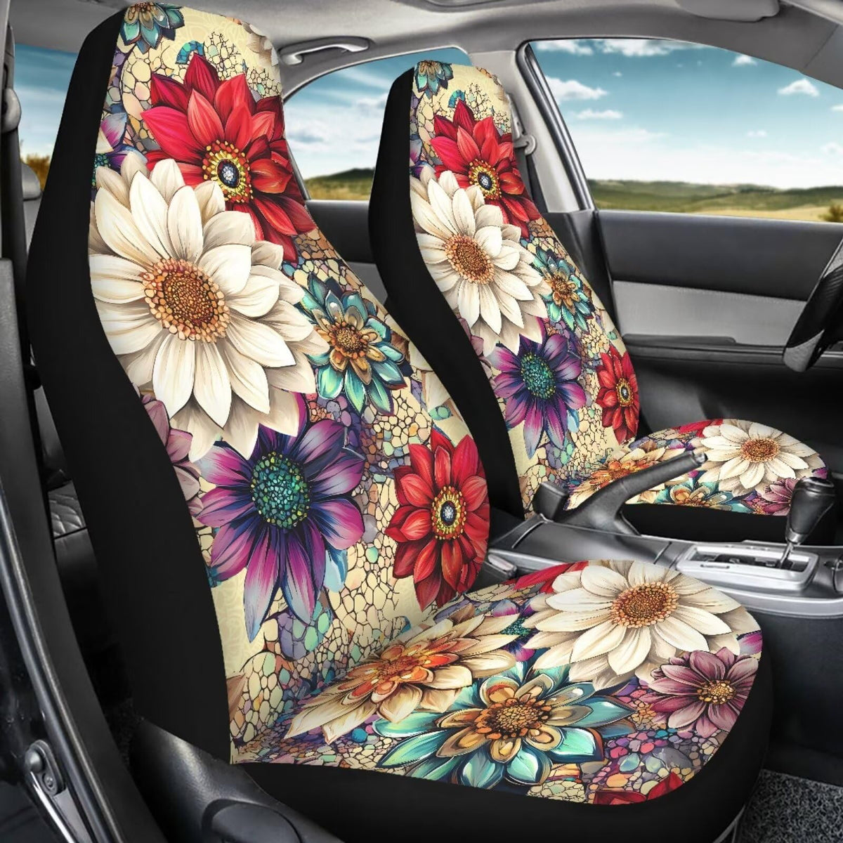 Bigcarjob Blossom Lotus Car Seat Covers Set For Front Only Boho Lotus Print Car Interior Accessories Cute Seat Protector For Car