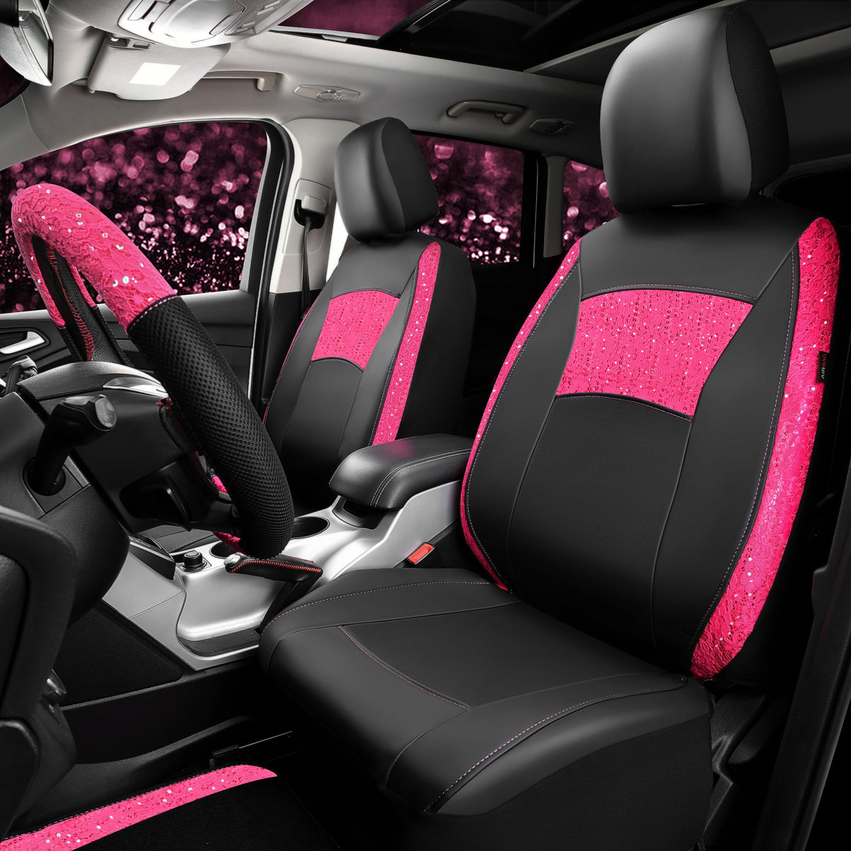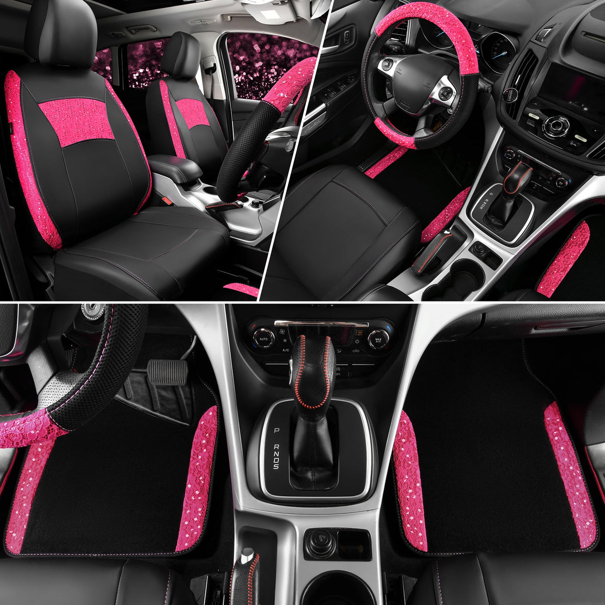 Car Pass Universal Leather Pink Lace Car Seat Covers Full Set For Women Girls, Waterproof Car Floor Mats Carpet, Steering Wheel