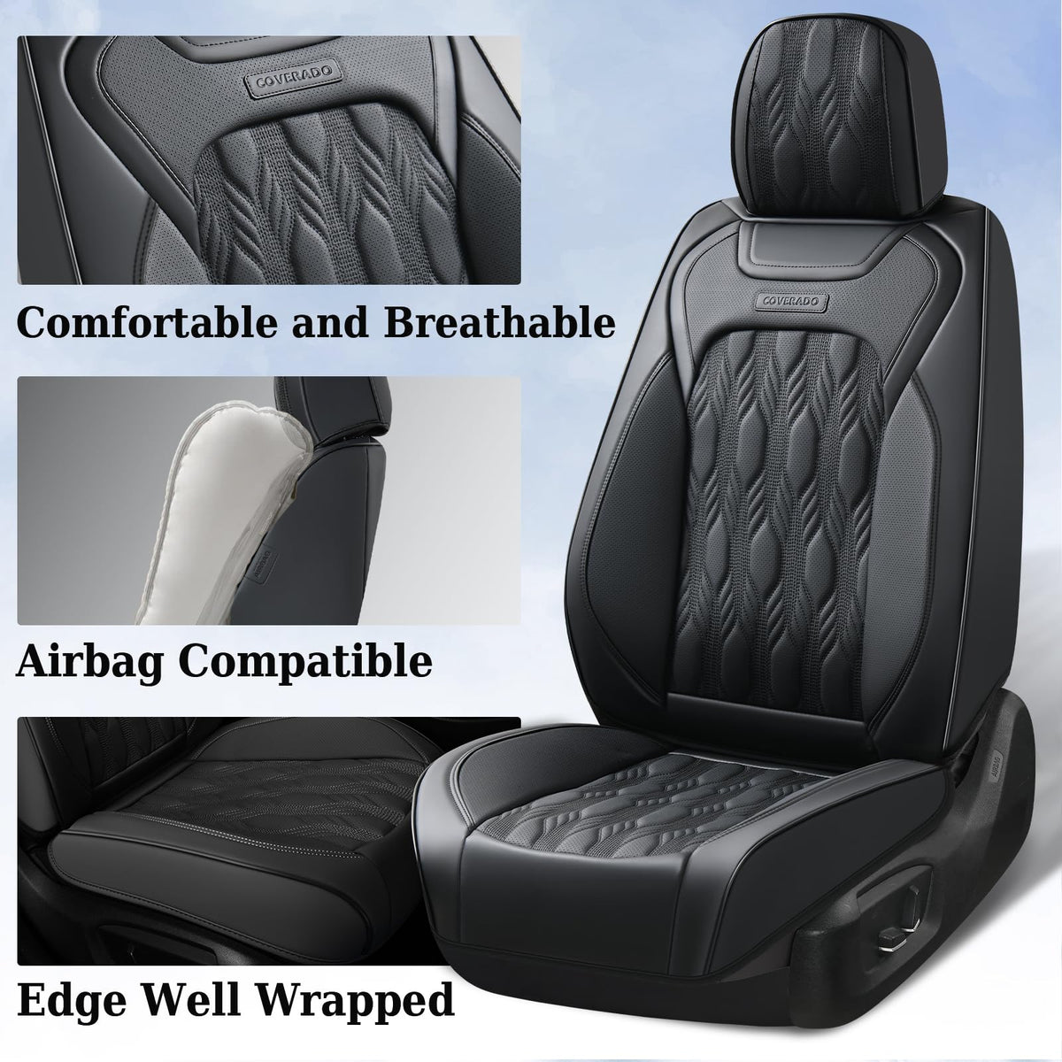 Coverado Car Seat Cover, Black Luxury Seat Cover For Cars, Premium Nappa Leather Seat Covers Full Set With Embossed Pattern, Wat