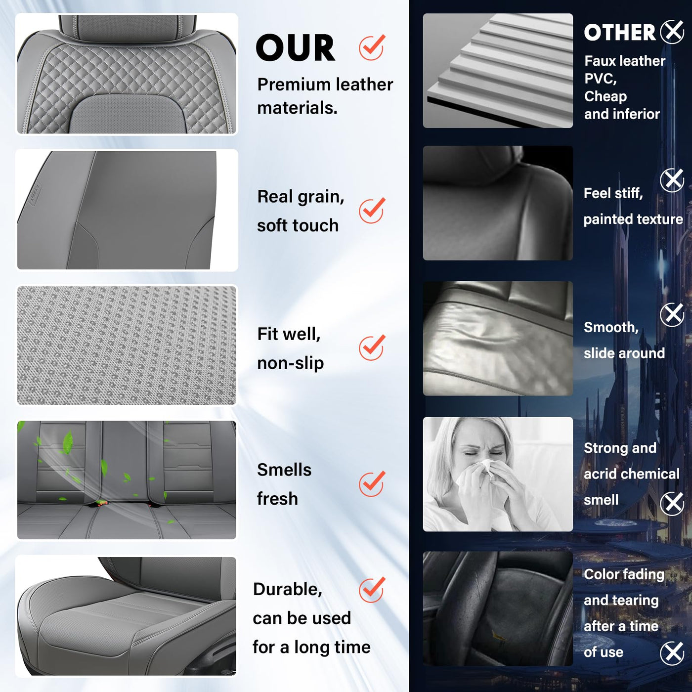 High Quality: These luxury seat covers are made from porous Nappa leather, making them smooth, breathable and gentle to the touch. They are filled with high elastic density foam padding to enhance the comfort of any vehicle cabin. Compared to PVC leather, Napa leather has realistic texture, no smell, soft touch and will not fade or tear even after long use. The Nappa leather seat covers can greatly enhance the luxury and beauty of the car | Elaborate Design: The full set of seat covers has a unique visual design which comes in a modern solid design with stitched trims to add a nice touch to your interior. Air vent back support and diamond purfle texture enhances the sense of fashion and touch. The package design on both sides of the car front seat cover is full of three-dimensional sense, which not only protects your seat enough, but also leaves enough room for the airbags so that they don't get clogged | Universal Fit: The design of the seat covers are suitable for 99% of cars, such as sedans, hatchbacks, crossovers, pickups, cabs, SUVs. It can be used as a protective cushion for pets or as a baby safety seat. The car seat covers are resistant to temperature changes, providing comfort in any seasons. The breathability ensures that you won't feel sticky during long drives. Even in hot weather, they keep the seats cool and don't cause any discomfort due to excessive sweating | Full Protection: These car seat protectors can cover unadorned seats and give the interior a new look, it can keep it safe from messy children and any potential damage to the seat, such as wear, dents, scratches, etc. Car pocket storage box is perfect for storing small items such as magazines, tissues, mobile phones, glasses, keys, loose change, and data cables. Individual headrest covers facilitate headrest adjustment for optimum comfort and safety | Easy Installation: Each pack includes 2 front seat covers. With chuck and hook, you can easily fix the seat cover. The back of the car seat cover has a non-slip surface for better grip and fits well in both the front seats of the car. Easy to disassemble and clean, whether it's sweat from sports and exercise, dirt and water droplets from children, spilled drinks, food, rain, dirt, debris and dust, they can be easily wiping away with a wet cloth