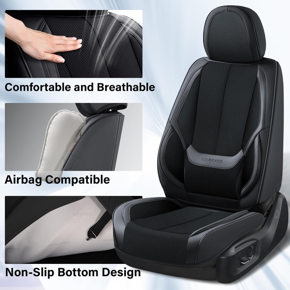 STYLISH DESIGN: Coverado seat covers with Lumbar Support is designed by 3D modeling, these car seat protector are stylish and modern which adding a touch of fashion to your interior. Car seat cushion with breathable fabric in center part, they can stay cool in the heat and warm in the cold. Providing you with a comfortable driving experience | UNIVERSAL FIT: Each pack comes with 2 front seat covers and 3 rear seat covers, which are compatible with most Cars, SUV, Truck and Pick-up. You can easily install a custom new look on your seats without any hassles | SUPERIOR PROTECTION: Car seat covers is contructed with durable leatherette and breathable fabric center sections, the seat covers can well protect car original upholstery from spills, stains, pet hairs and harmful UV rays. They are resistant to fading, gentle to touch, and made for years to come | MAINTAIN FUNCTIONALITY: Black seat covers are engineered around the car, keeping the seat's full function and control, such as airbag, seatbelts, armrests and seat adjustiments. Separate headrest covers allow easy headrest adjustment for optimal comfort and safety | DEFINE YOUR RIDE: Car seat covers full set are availabe in various colors, these seat covers for cars can satisfy your desire to define the ride, imparting a high-performance look to your vehicle. If part is missing or damaged, please let us know and we will send replacement parts or provide other solutions