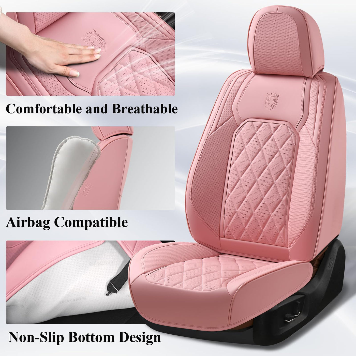 SUPERIOR LEATHER: Coverado seat covers are made from perforated NAPPA LEATHER and DURABLE FAUX LEATHER with high-resilience foam padding. This pink leather seat covers are resistant to wear, smooth, breathable, and soft to the touch, providing you with a comfortable driving experience | LUXURY DESIGN: These charming car seat covers feature a delicate diamond stitch design that adds a touch of modernity and luxury. The unique full wrap-around design protects car seats from spills, dirt, scratches, pet hair and harmful UV rays. Its luxury coordinateds with most car interior styles, making it the perfect cover for any car | EASY INSTALLATION: Driver seat cover are designed to be install easily. With the chucks and hooks, the seat covers can be firmly fixed on the seat and kept well without moving. (Details as video or user manuel) . You can easily install a custom new look on your seats without any hassles | UNIVERSAL FIT: The car seat protector is 3D modeled and fit for most sedans SUV pick-up truck. Automotive seat covers just cover the seat but not inhinder the original functions. Every auto feature is retained, like airbags, seatbelts and even massage | PACKAGE CONTENTS: Each pack includes 2 front seat covers and 1 Installation guide. If parts are missing or damaged, please let us know and we will provide a solution for you