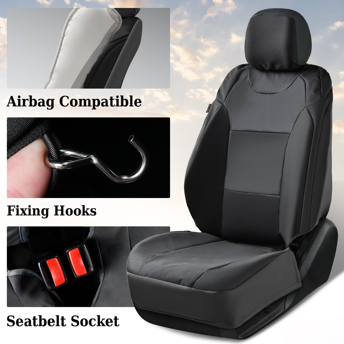 Q: What material are Coverado Front Seat Covers made from?A: The Coverado Front Seat Covers are crafted from durable Oxford fabric, which is lightweight, wear-resistant, and waterproof, providing excellent protection against spills, dirt, and damage.