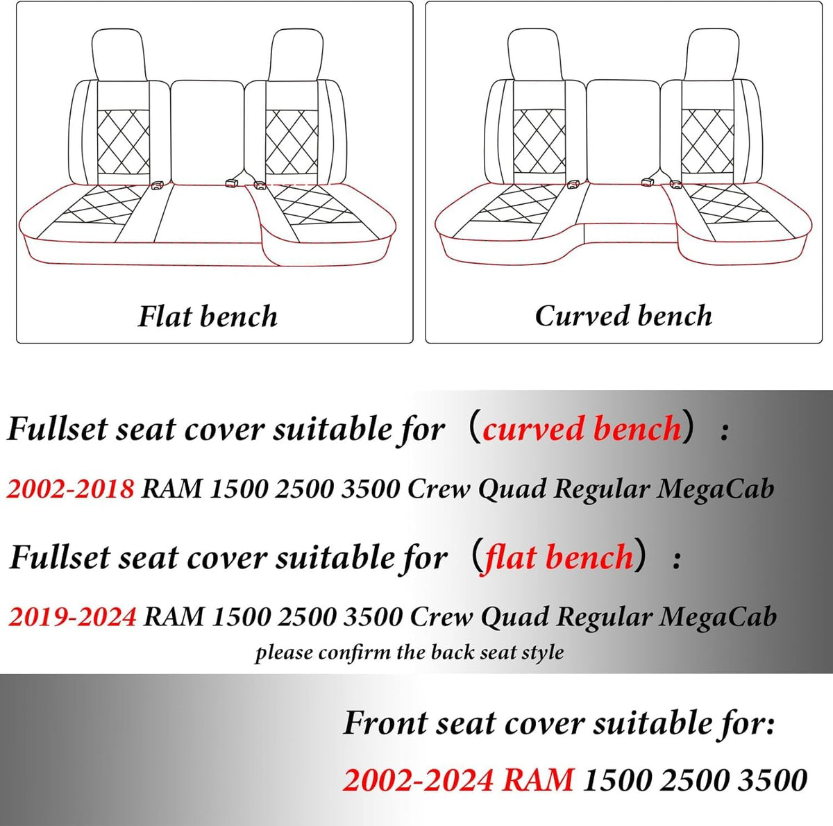CUSTOM FIT: Our seat covers are compatible with Dodge RAM 2002-2024 1500 2500 3500 Crew Cab, Double Cab, Quad Cab, Mega Cab. Dodge ram seat covers customised just for your car | EXCELLENT MATERIAL: Coverado seat covers are made of high quality faux leather, simple and fashionable, which can protect your original seats from dirt, dust, dog hair and UV rays. And it is not easy to fade, gentle touch, can protect your car interior effectively for a long time | MODERN DESIGN: Without affecting the original function of the seat, the leather seat covers is compatible with airbags and seat belt sockets, suitable for families with small children and pets Both seat cooling and heating functions work properly and efficiently | QUICK-INSTALL: The automotive seat covers is easy and quick to install and can be securely fastened using chucks and hooks, so it won't slip off even after prolonged use. We provide installation videos and installation manuals to help you install quickly | PACKAGE CONTENTS: Each set includes front seat covers (including centre armrest covers). And ram 1500 seat covers can easily be cleaned by wiping with a towel. Various colors to select from, you can define a new look for you car as you like