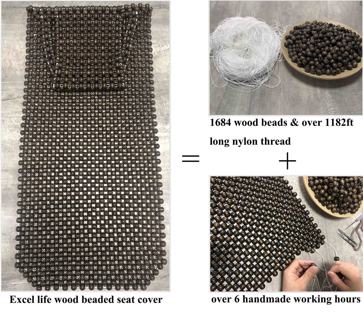 Q: What materials are used in the EXCEL LIFE seat cover, and are they durable?A: The seat cover is made from high-quality solid wood beads strung on a heavy nylon line, ensuring sturdy and long-lasting construction. It is designed to withstand regular use throughout the year.