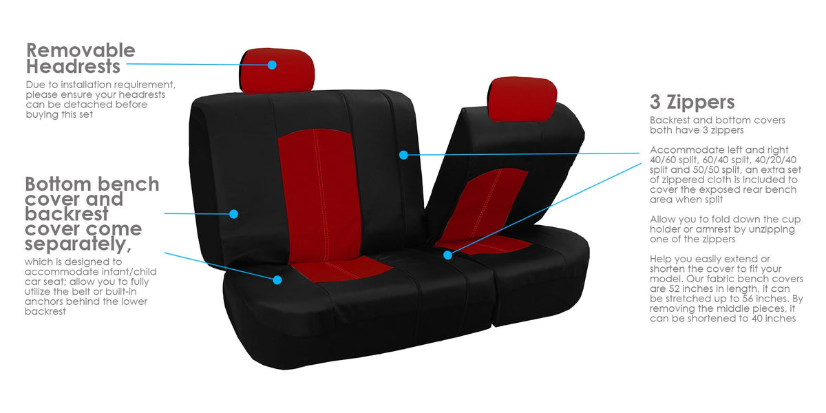 FH Group got you covered! Our full set of premium Faux Leather car seat covers not only provide the best protection for your car's upholstery against any type of mess but they also enhance the looks of your car's interior. No need to worry anymore about spills, stains, mud, or anything damaging your original car seats because this car seat protector got your back. This full set of car seat covers includes two front low back seat covers, which are compatible with most sedans, SUVs, and vans seats with removable headrests only. Our rear seat covers are fully compatible with 50/50, 40/60, or 60/40 split rear benches or longer benches. The cover features 3 zippers in the backrest AND bottom, and extra mesh pieces so you can move the rear seat freely or use the middle arm rests and get full protection. We understand messes happen, thats why these water resistant car seat covers are very easy to clean. Simply wipe clean the car seat cover with a wet rag. Our water resistant faux leather cover for car seats covers for cars are convenient for any type of driver. We offer automotive seat covers in numerous fabrics, colors, and designs, so you can easily find the seat cover for cars that fits your style the most. We have car seat covers for women, for men and for everyone. FH Group car seat covers are a great car interior accessory for your vehicle. We have it all: car seat covers for SUV, car seat covers for autos, car seat covers for vans, you name it!