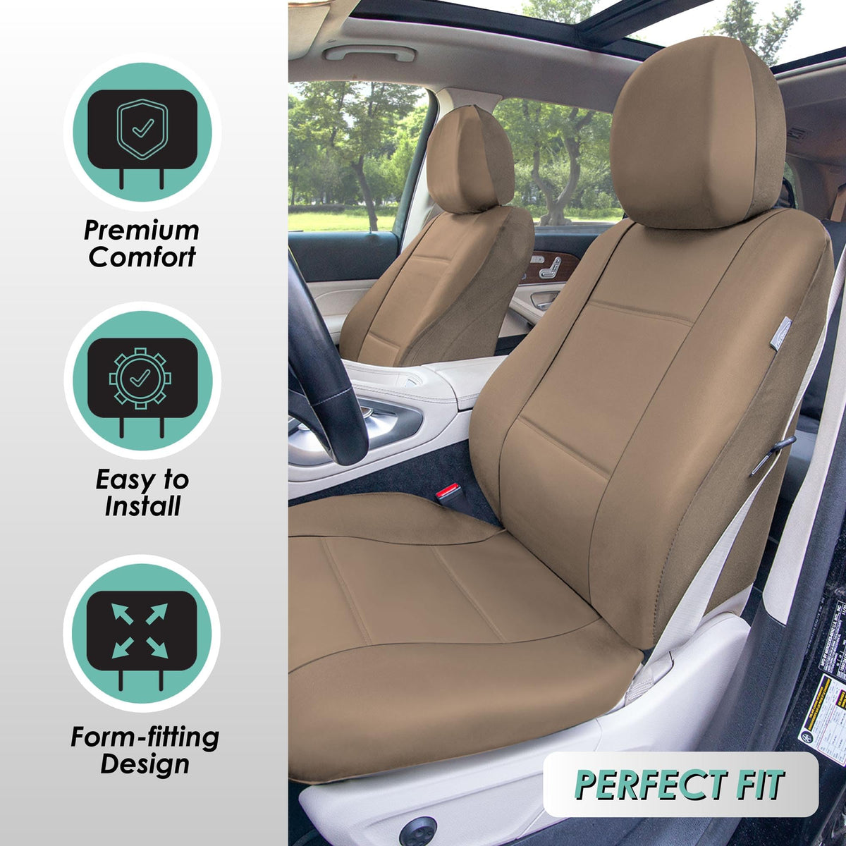 FH Group got you covered! Our premium cloth car seat covers not only provide the best protection for your car's upholstery against any type of mess but they also enhance the looks of your car's interior. No need to worry anymore about spills, stains, mud, or anything damaging your original car seats because this car seat protector got your back. Every car seat cover we make is built with quality, durable materials that will protect your car's upholstery at all times. We offer automotive seat covers in numerous fabrics, colors, and designs, so you can easily find the seat cover for cars that fits your style the most. We have car seat covers for women, for men and for everyone. Our auto seat covers are compatible with most sedans, SUVs, and vans front seats thanks to the universal low back seat cover design that delivers the snug fit you're looking for, only if the front seats headrest is removable. Also, because safety is one of our main goals, this front set of cover for car seats is airbag compatible (officially tested!). We understand messes happen, thats why these waterproof seat covers for cars are convenient for any type of driver. FH Group car seat covers are a great car interior accessory for your vehicle. We have it all: car seat covers for SUV, car seat covers for autos, car seat covers for vans, you name it!