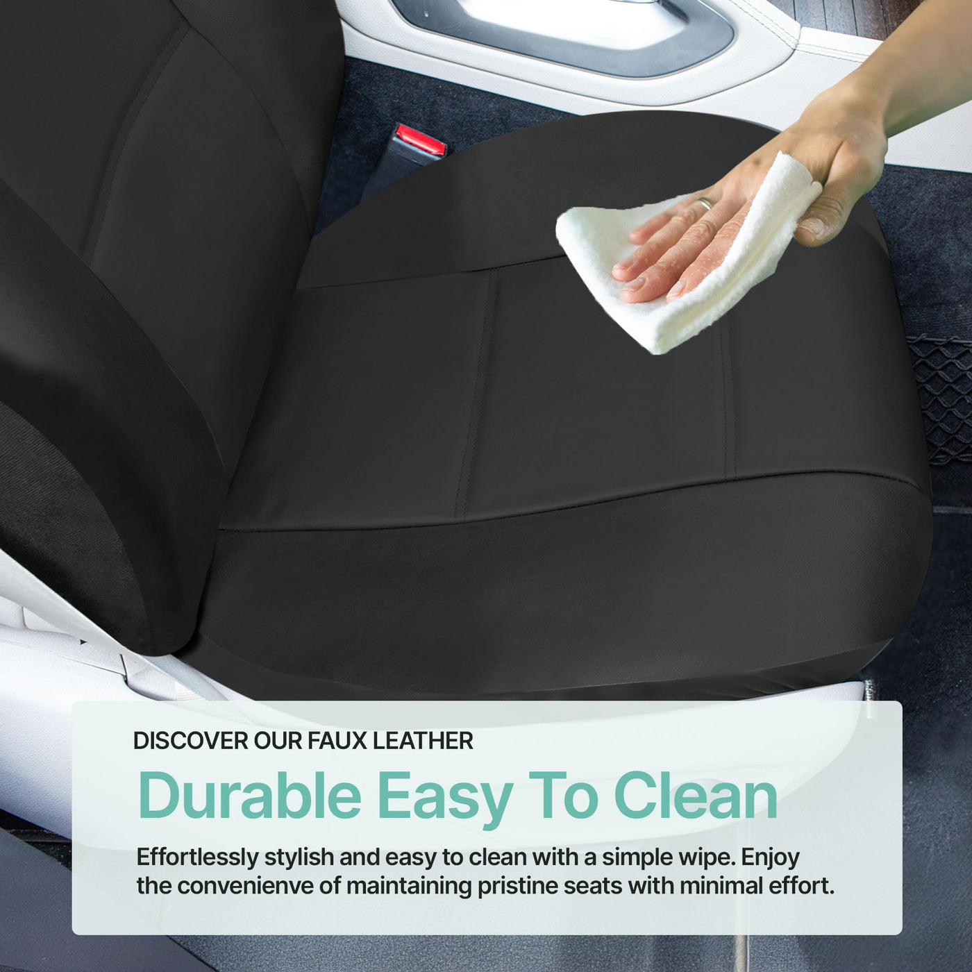 Q: How do I clean these faux leather car seat covers?A: Cleaning the FH Group Car Seat Covers is simple. Since they are water resistant, you can easily wipe them clean with a wet rag to remove spills and stains, keeping your car interior looking fresh and tidy.