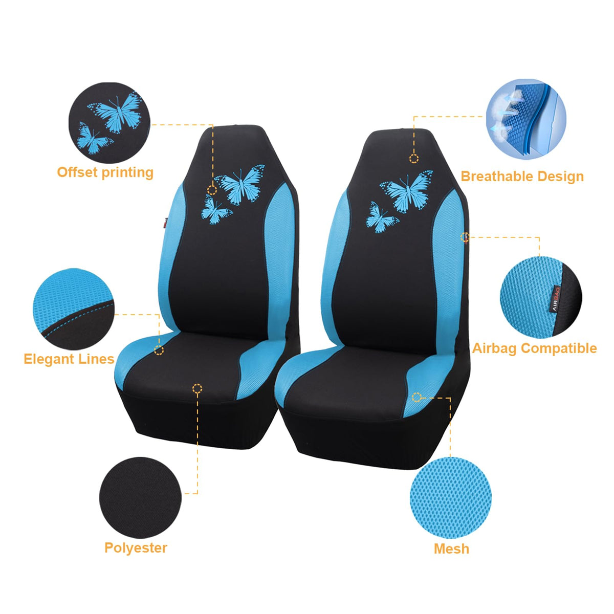 About us Welcome to Flying Banner. Our main products are car seat covers, car seat cushions, car steering wheel covers, floor mats, etc.. our target is to provide Eco friendly, comfortable and safe products to all our customers. Product description Material:Polyester, Mesh Color: Black Mint Blue Condition: Brand new Number of piece:2 PCS Product features ?Safe:Compatible airbags on both sides of front seat. ?Odorless:We choose the Eco-friendly materials to produce the seat covers. ?Universal sizes, can fit most of high bucket and low bucket car seats. ?Beautiful:Different color of beautiful butterfly designs, change your car interiors in seconds. ?All round protectionBack materials are fully covered seat back. ?Easy cleanMachine washing and air drying. ?Easy to installFixing plug and elastic belt are used for seat cover, which makes installation more easy, no need to dismantle your car seats. Product Fitments Universal Seat Covers.Perfectly for most low back and high back car seats of car,truck,SUV and van. Detachable headrest and airbag compatible,car seats with side arm rests are compatible. If you don't make sure whether this item fits to you, message us with your vehicle year, maker and model, we will find the item you need. Important Information Because of the difference between the display and the light, there may be a slight deviation in color. The side sewing seam of the seat cover is compatible with the airbag. Which is sewn by special thread, Do not pull hard when installing, which may cause cracking. Usually,metal hooks in the headrest. Contact us If you have any question about the products,do contact us first. If the product is not fit for your car, we accept returns. If you have any questions, please dont hesitant to contact us.