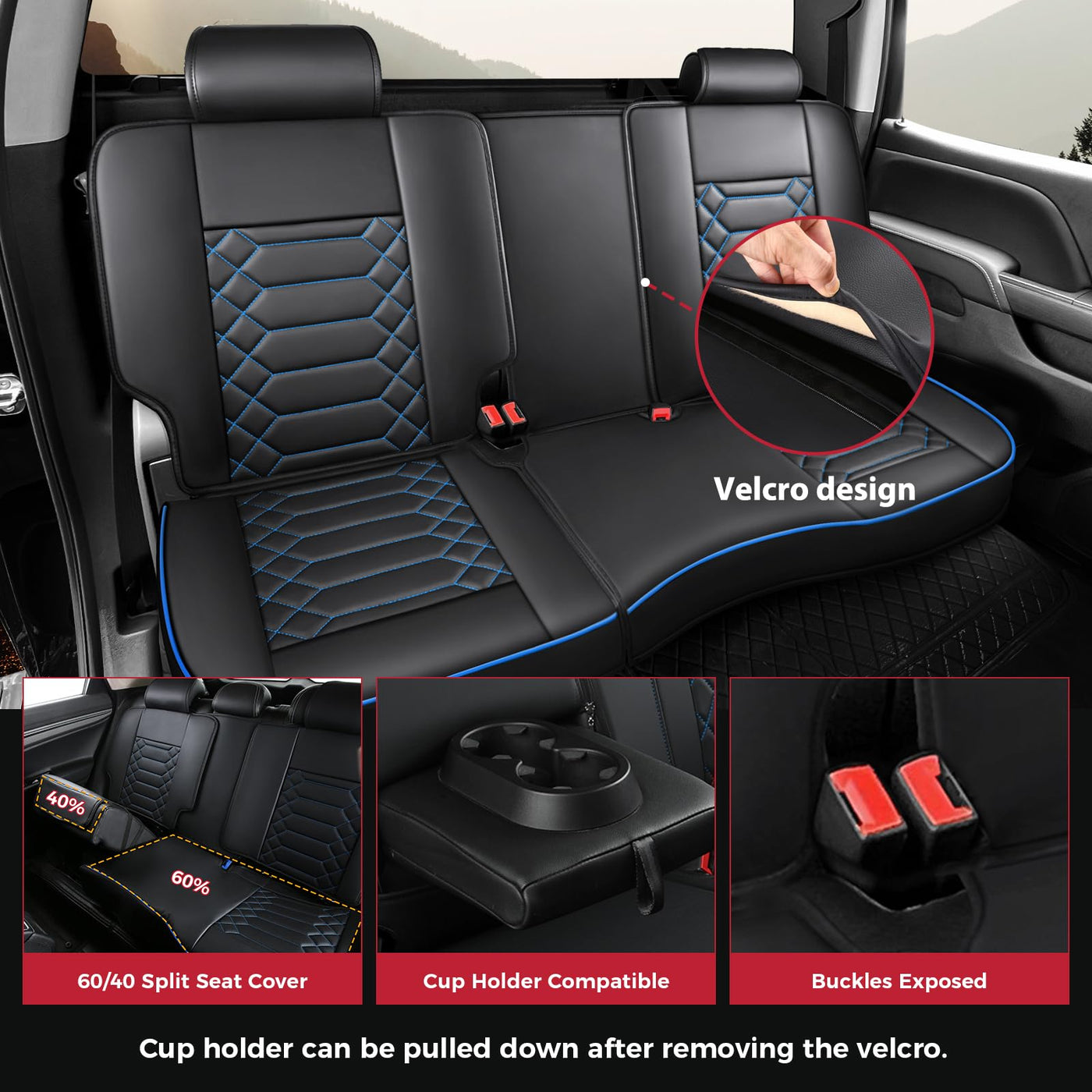Custom for 2014-2018 Chevy Silverado 1500/2500/3500 Material: faux leather 3 Colors Available: Black, Black-Red, Black-Blue Feature: 1. Automotive seat covers are made of faux leather with soft composite sponge, comfortable, and waterproof, anti-scratched, just clean easily with wet towel. Bottoms are non-slip fabric, prevent from sliding when getting on and off. 2.40/60 Design: bench seats are covered individually, you can fold the 40/60 seat as you like to store goods or sit and cushions never fall apart.. Installation: Follow the step-by-step installation video(which takes you about 30 minutes) made installation quick and easy. Package Includes: 12 pieces in total Front Headrest * 2, Front Backrest * 2, Front Bottom Cover * 2, Rear Backrest* 3, Rear Bottom Cover* 2, Rear Headrest;*1, Required installation guide and accessories .