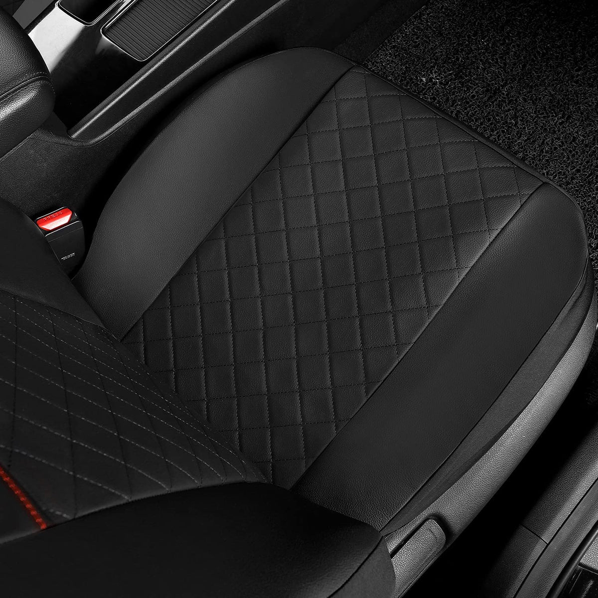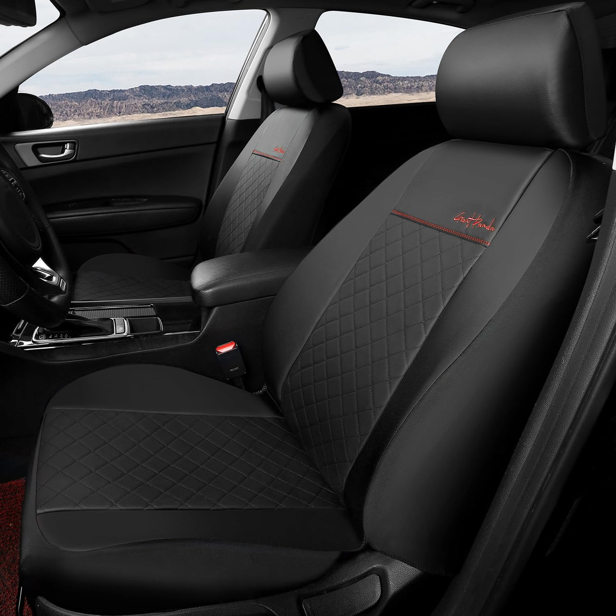 Front car seat covers fit Toyora Rav4, Camry, Highlander, Corolla, Prius, Venza, Avalon.(2-Pack) | Simple and stylish diamond pattern seat covers with unique brand logo and two-tone design, they will give your front seat a new look and provide all-round protection for the original seats. | The back is polyester fiber, stretchable. Leather bucket seat protector. | These full-cover seat covers will protect the original seats from wear, stains, animal hair, and give your car interior a new look. Breakaway seam for side-impact air bag compatibility. | Easy to install. After reading the installation instructions, you can easily install these front seat covers in a few minutes without any tools.