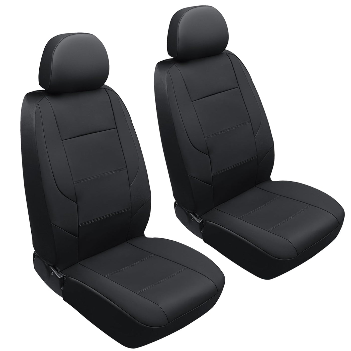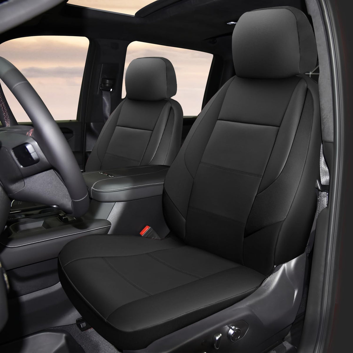 Front car seat covers fit GMC Sierra 1500 2500 3500. | Simple and stylish diamond pattern seat covers with unique brand logo and two-tone design, they will give your front seat a new look and provide all-round protection for the original seats. | The back is polyester fiber, stretchable. Leather bucket seat protector. | These full-cover seat covers will protect the original seats from wear, stains, animal hair, and give your car interior a new look. Breakaway seam for side-impact air bag compatibility. | Easy to install. After reading the installation instructions, you can easily install these front seat covers in a few minutes without any tools.