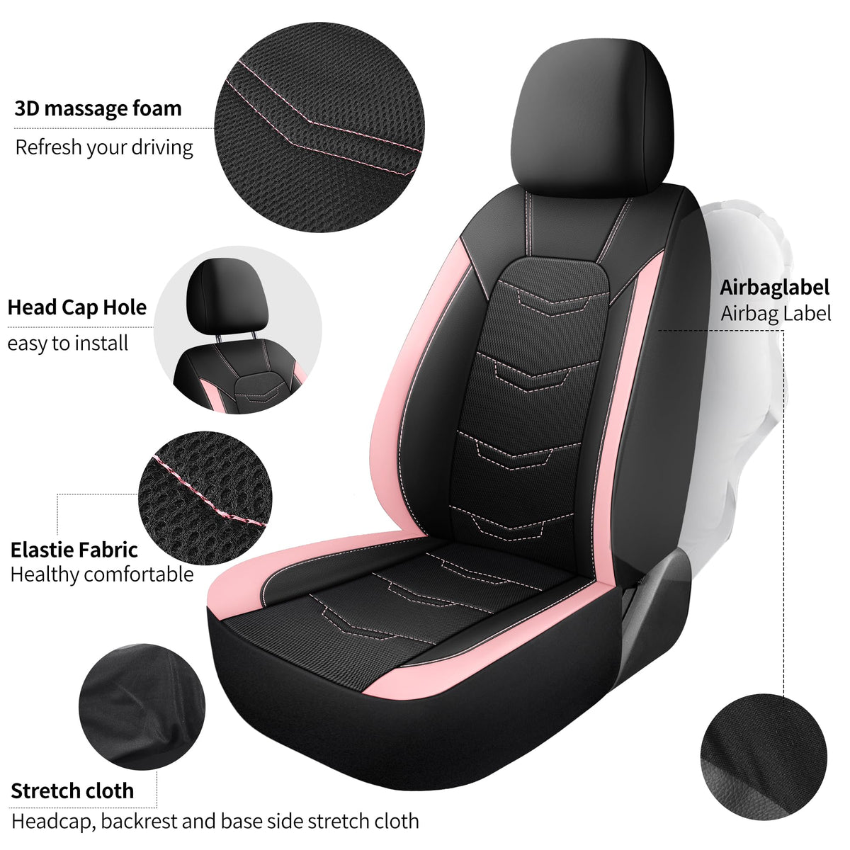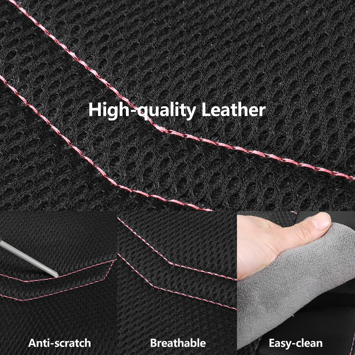 Universal Fit:Elevate your car's interior with our premium leather seat covers, meticulously crafted for durability and style. Designed to seamlessly complement most vehicles, they offer a luxurious feel and a distinctive look. Enhance your driving experience today with compliments guaranteed. Includes 2 front seat covers and 2 separate headrest covers in an easy-to-carry package. | Sport Design:The sporty design of our car seat covers focuses on both comfort and functionality. We use breathable materials to enhance ventilation and incorporate perforations for a balance of sportiness and coolness. The seat covers feature reinforced sections to improve support. Vibrant colors and dynamic lines not only boost the sporty look but also provide better coverage and protection. | Easy Installation:Installing our car seat covers is simple to do. Whether you're an experienced DIYer or new to car accessories, our comprehensive installation guides and videos make it easy to get started. If you have any questions, our responsive customer service team is ready to help. | Airbag Compatible:Our seat covers are airbag compatible, featuring reserved openings for headrest covers and seatbelts. Designed to fit most vehicles effortlessly, installation is quick and hassle-free. | Reliable Service:Installation is simple and requires no tools. We suggest watching our detailed installation video for help. Purchase with confidence, as you