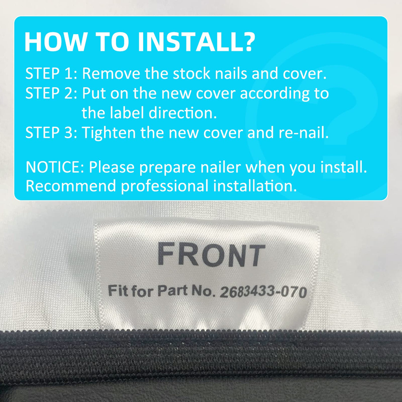 Q: How do I install the JAVIK Upgraded Seat Cover?A: To install the JAVIK Seat Cover, first remove the stock nails and the existing cover. Next, place the new cover according to the label directions. Finally, tighten the new cover and re-nail it in place. It's recommended to have a nailer ready for installation and to seek professional help if needed.