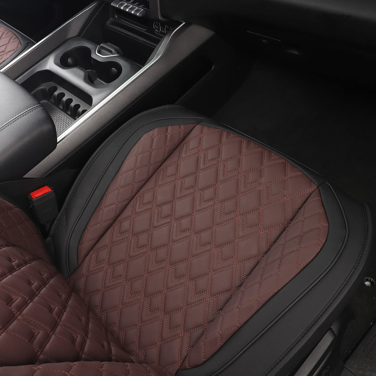 Q: What materials are used in these seat covers?A: The seat covers are made from high-quality faux leather, which is durable, waterproof, and easy to clean. The interior features thick sponge padding for comfort, while the bottom layer includes non-slip silicone for added stability.