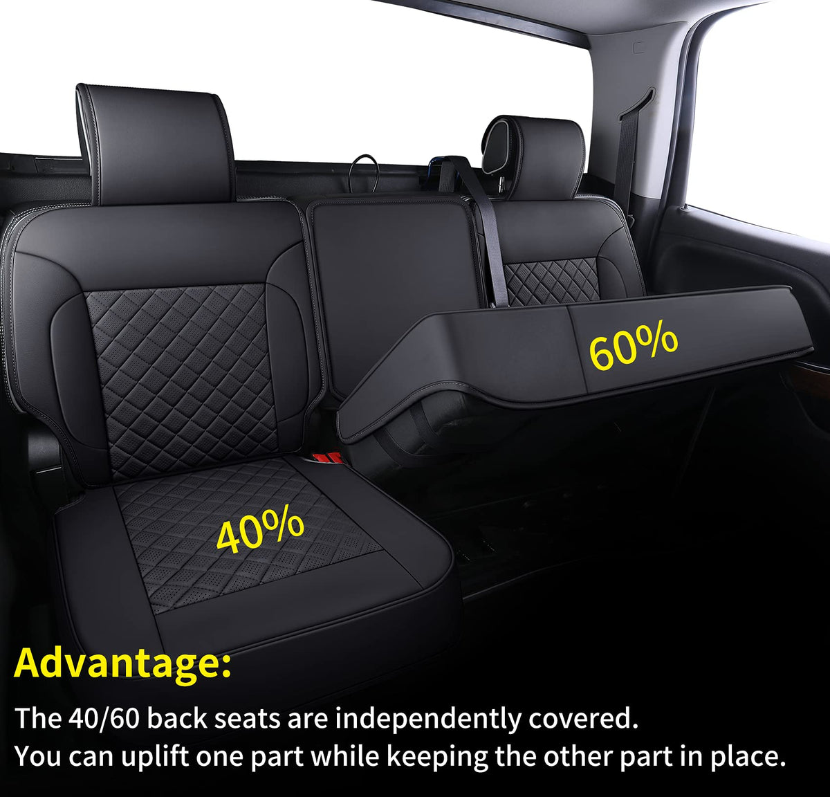 Important 1. UPGRADED: Both sides of the back of front seats are covered with our upgraded custom Silverado/Sierra Seat Covers, but an opening is reserved for the airbag to deploy. 2. UPGRADED: With the upgraded front headrest covers, you can put on (NOT strap) them as easy as you put on a hat, and both sides are covered. 3. UPGRADED: Back seat covers are designed to independently cover the 40% section and 60% section, let you easily fold up either section without removing the covers. 4. The seat cover showed in the manual included in the package delivered to customers is for illustration only, may different from the one you receive. 5. We included a free console cover in the full set package and front cover package. But if your front seat is 40/20/40 split, you may have to buy a separate cover for the third seat. 6. Its very rare but possible that you may receive wrong items, or find some parts are missing or defective, tell us by email before you request to return, you will receive a satisfactory solution.