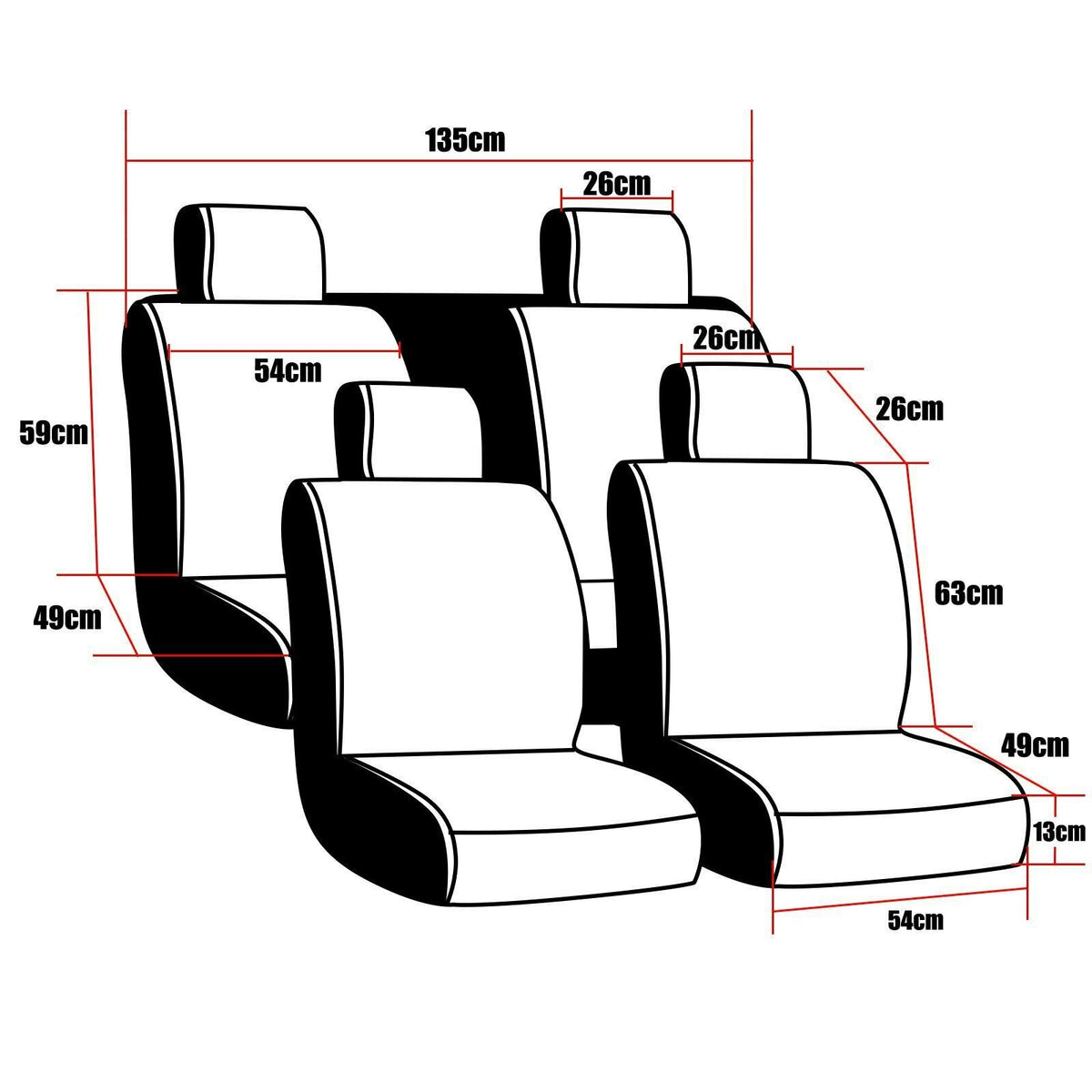 Product Description: The Car Seat Protector Brand new, never been used Design:Head design is simple; binding is wearproof; EMB process is stylish and elegant. Matched with neck pillow and lumbar pillow,it can relieve your fatigue The back is close designed and whole surrounded; it reserves for airbag outlet,beautiful and safe. Large base in front row and whole surrounded design at side of front seat which has no shifting and slide protect the car seat well. Storage bag is designed for front seat which is practical. 3 in 1 rear row,reserve for airbag outlet,small head cap in centre, durable and safe. Color: Black/White Line Material:PU leather, Sponge, Non-woven fabric, Suede Surface Finish:PU Leather Placement on Vehicle:Left, Right, Front, Rear, Upper, Lower Warranty:Yes Fitment Type:Direct Replacement Front Row: Length: 52cm, Width: 48cm Backrest height: 60cm Head cap height: 20cm Cap width: 26cm Rear Row: Length: 140cm, Width: 45cm Backrest height: 60cm Head cap height: 20cm Cap width: 26cm What's in Package: 3X Seat Covers (2Pcs for Front & 1Pc for Back) 2X Neck pillows 2X Lumbar pillows Some Hooks and Chucks Compatible With: Universal Fitment