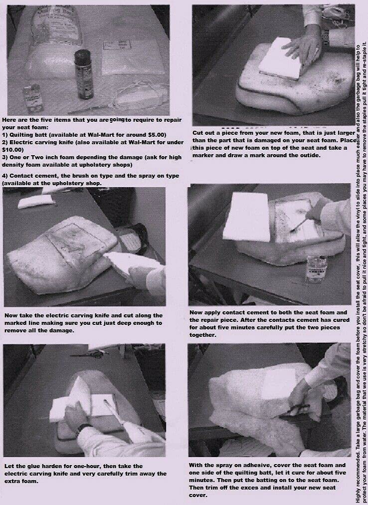 Q: How do I install the new seat cover?A: To install the new seat cover, it is recommended to first cover the foam with a piece of plastic or a garbage bag. This will help the cover slide into position more easily during installation.